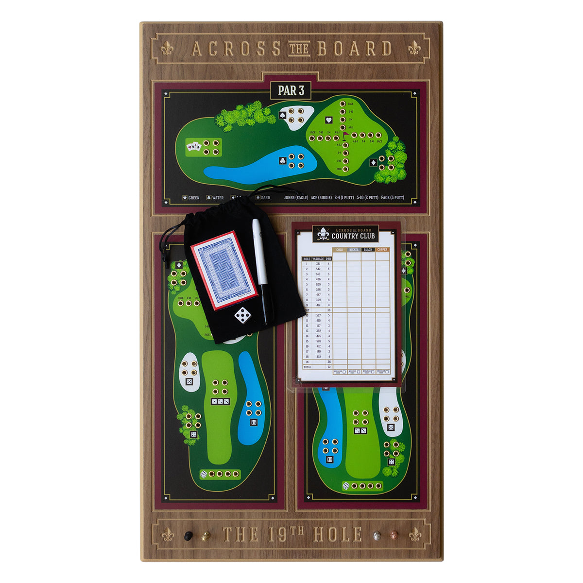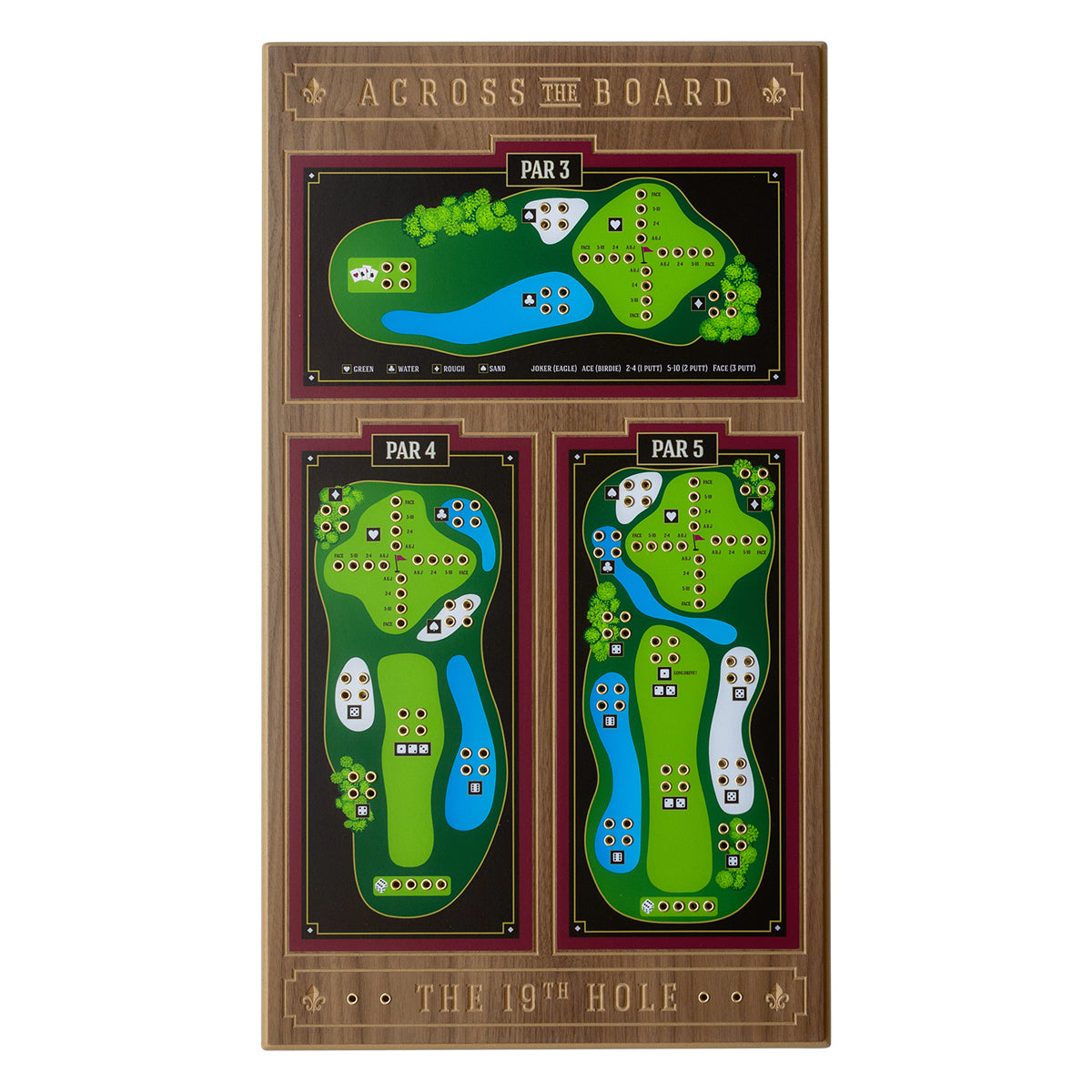 Fore! Play a round of golf with your friends using dice and a deck of cards. Players can compete and gamble with friendly wagers just like you’re on your home course. The 19th Hole Golf Board Game is played on our beautiful walnut-finished game board measuring 28” x 15”. The playing surface is built for beauty and longevity with each metal grommet driven in by hand. The rules of the game are simple enough for children to play, while the included side wagers make it fun and exciting for adults. A match can be with 2-4 players or can be played as a party game with teams.