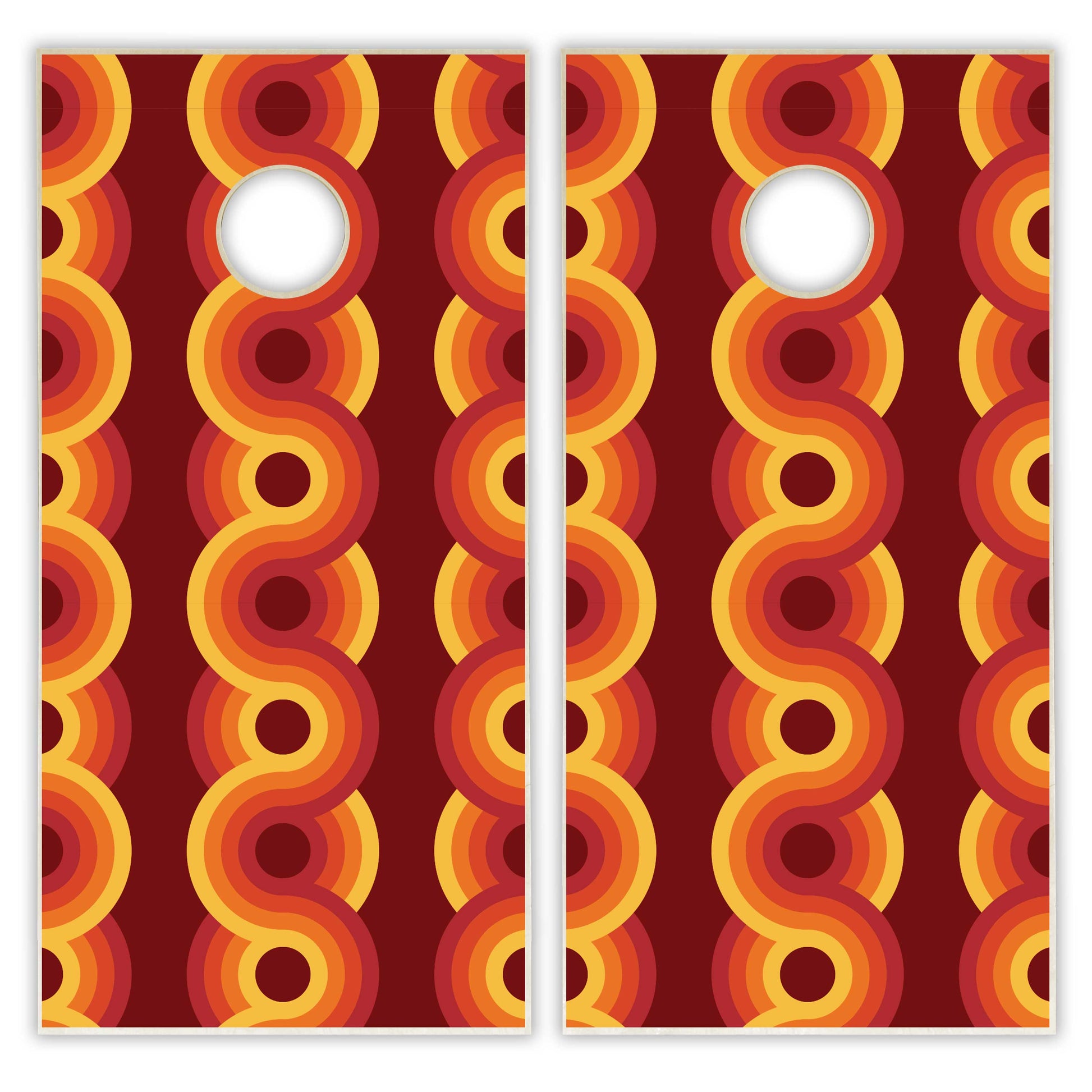 Show off at your next event with this specialty-designed 70s Circular Pattern Cornhole party game set!