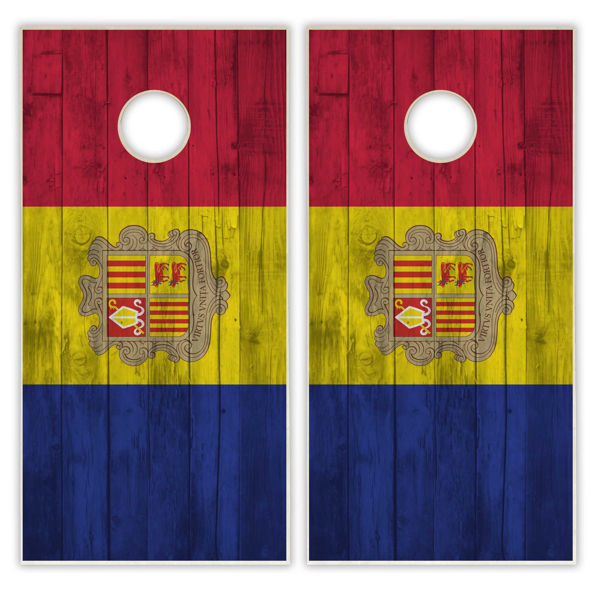 Show off at your next event with this specialty-designed Andorra Flag Cornhole party game set!