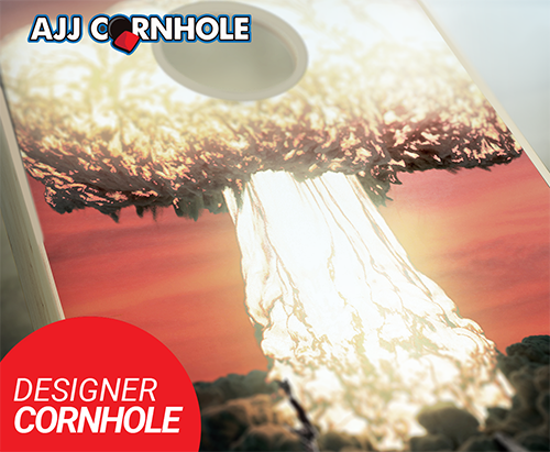 Show off at your next event with this specialty designed cornhole set! The mushroom cloud sticker decal is printed vinyl finished with a clear coat of polyurethane to protect your boards for years. This 24"x48" set of cornhole boards comes with folding legs and you can add a full set of 8 standard cornhole bags. The boards are completely sanded for a smooth finish. These boards are made of quality 1/2" plywood and will hold up to anything you throw at them. Great for a BBQ, tailgating, camping, or just a relaxing day in the sun. Our boards are ACA Certified!