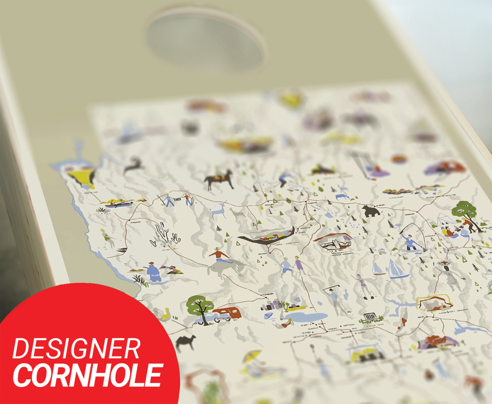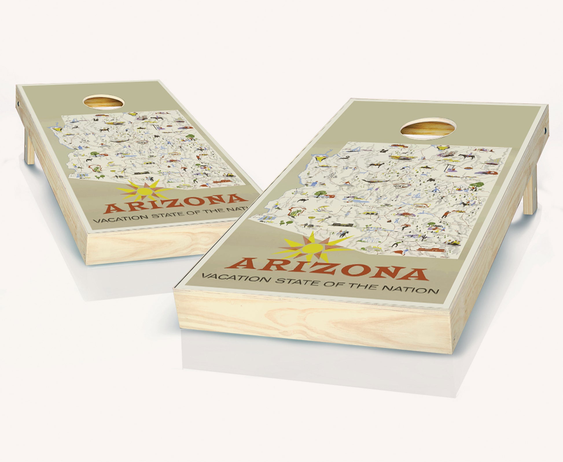 Show off at your next event with this specialty designed cornhole set! The decal is printed vinyl and finished with a clear coat polyurethane to protect your boards for years. This 24"x48" set of cornhole boards comes with folding legs and you can add a full set of 8 standard cornhole bags. The Arizona state map cornhole boards are completely sanded for a smooth finish. These boards are made of quality 1/2" plywood and will hold up to anything you throw at them. Great for a BBQ, tailgating, camping, or just a relaxing day in the sun. Our Arizona state map cornhole setup is ACA Certified!