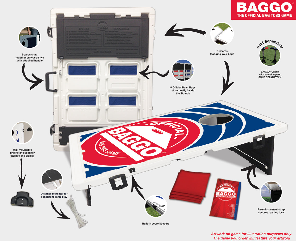 BAGGO is a 2 x 3 blow molded portable bean bag toss game fun for the whole family. The Official BAGGO game boards are constructed of blow-molded, lightweight, high-impact polyethylene, which provides lasting durability for years of enjoyment. Game board features include All Weather material, built In scorekeepers, pop out carrying handles & internal bean bag storage.