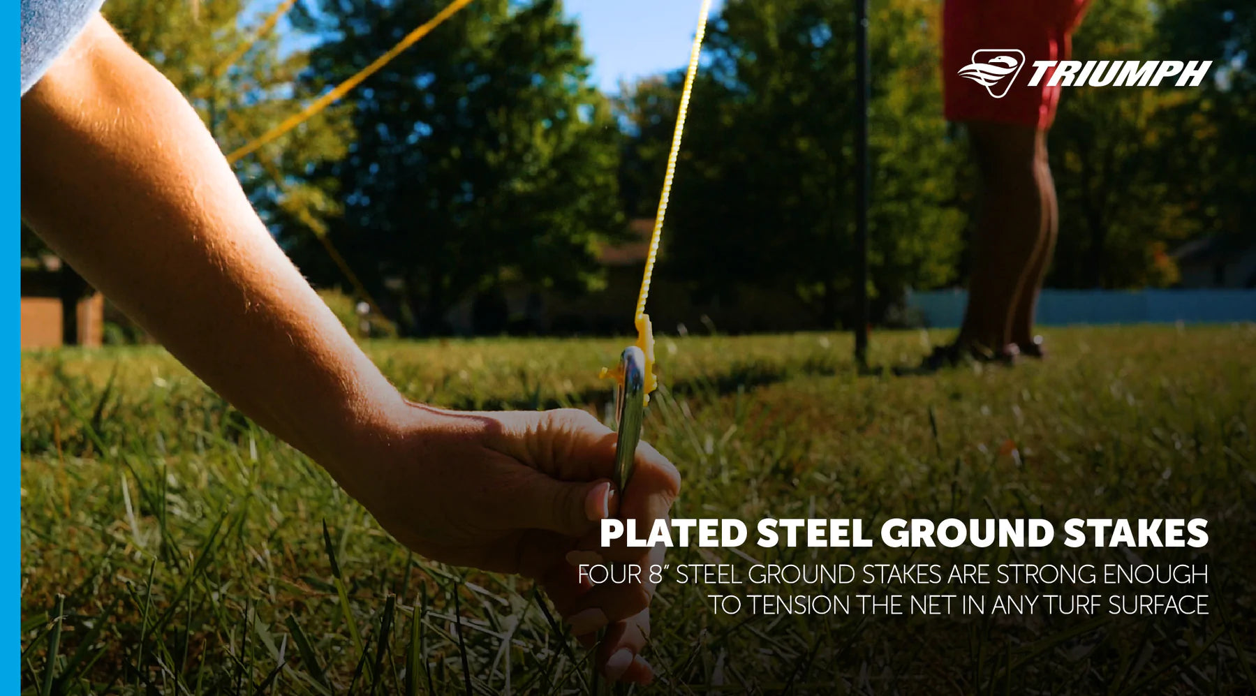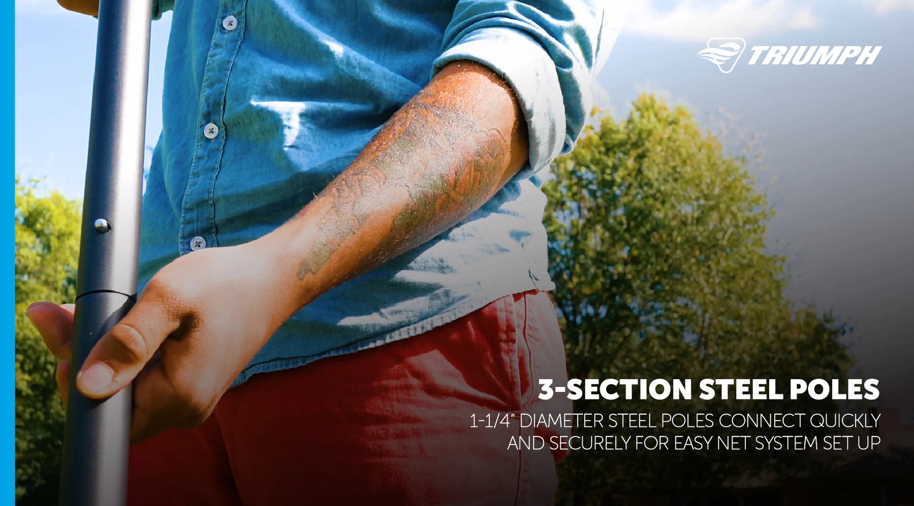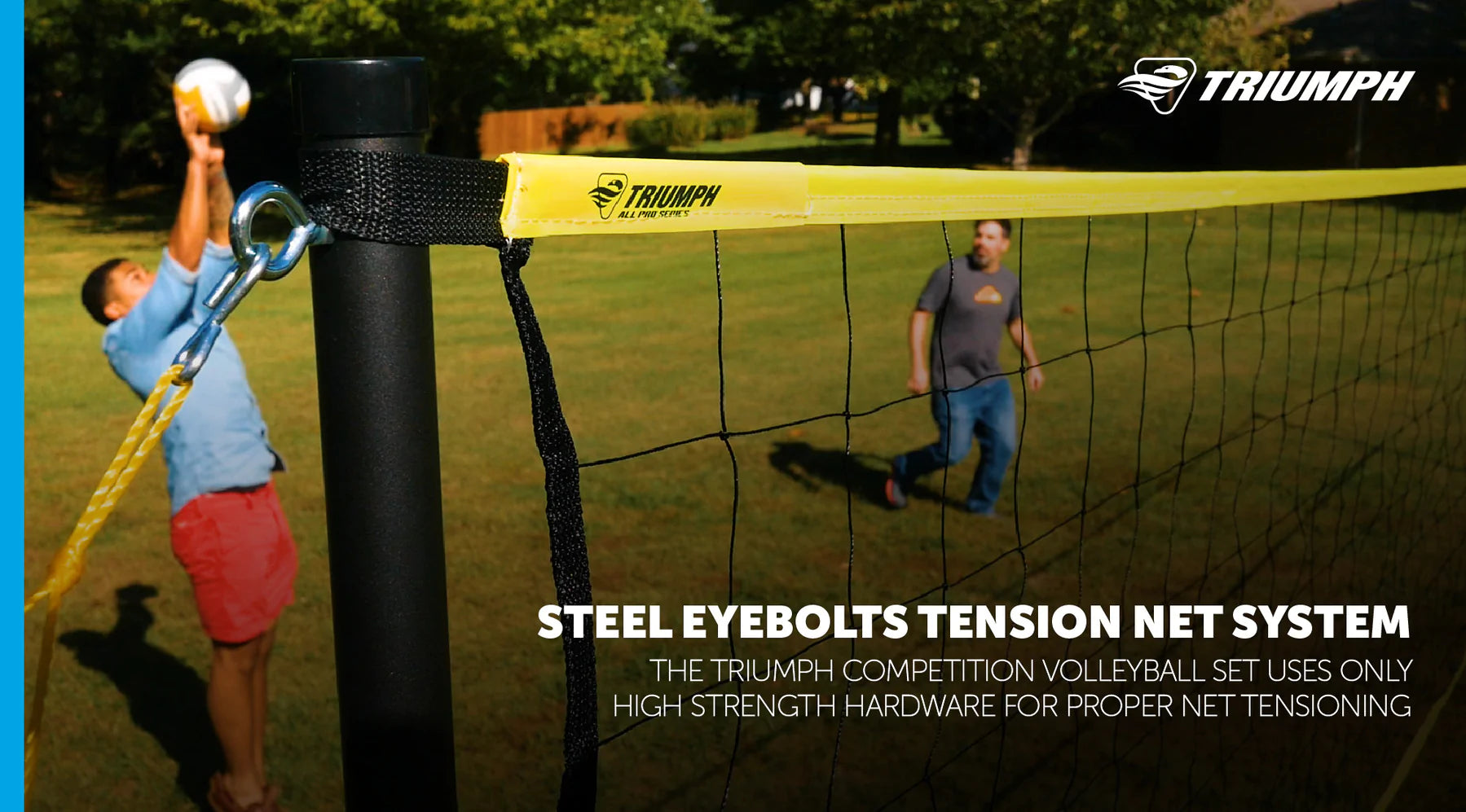 Serve up some fun under the sun with the Triumph Competition Volleyball Set. A portable beach/yard volleyball set should be both easy to set up and sturdy enough to withstand action at the net. This set includes all the essentials of a high performance portable set: steel poles over 1", a performance net with tape on four sides, easy-tensioning guylines with steel stakes, and a boundary line to know when balls are in or out. This portable volleyball set goes together in a few minutes: connect the 3-piece pole lengths, unfold the net and slide over the poles, connect the guylines to the eyebolt at the top of the poles, stand poles upright, tension guylines and stake down the boundary line. Let the competition begin! When the games are over everything packs back onto a Triumph shoulder bag designed with a padded shoulder strap for a comfortable journey back to the car or SUV.