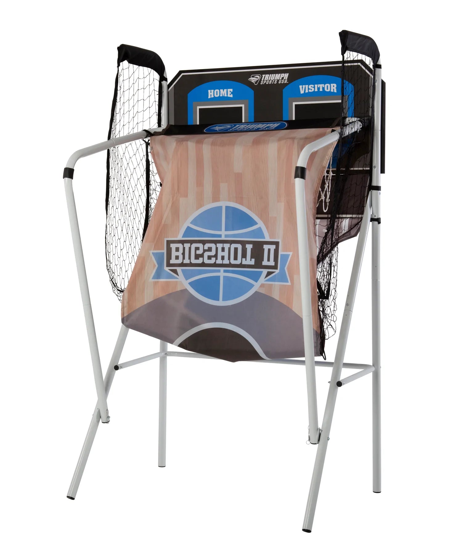 The Triumph Big Shot II Double Shootout basketball game is the ideal choice for competitive head-to-head arcade basketball. Featuring large 1.5" diameter poles and durable metal rims, its sturdy frame construction is built to last and take on vigorous gameplay. LED electronic scoring with a time clock keeps track of the action for 8 different games. Easily start and stop games and navigate between each game mode using the included control panel at the base of the shootout. The Big Shot II's electronics have a dynamic and flexible dual power system that allows you to play using the included AC adapter, or break free from the electrical outlet and play anywhere with a battery-powered option (3 AA batteries not included). The double shootout basketball game set arrives ready to play with 4 basketballs, a pump, and a needle. When finished playing, the frame folds and locks into place for easy storage when not in use (39.5" L x 49" W x 81" H). Compete with the best using the Triumph Big Shot II basketball shootout game.