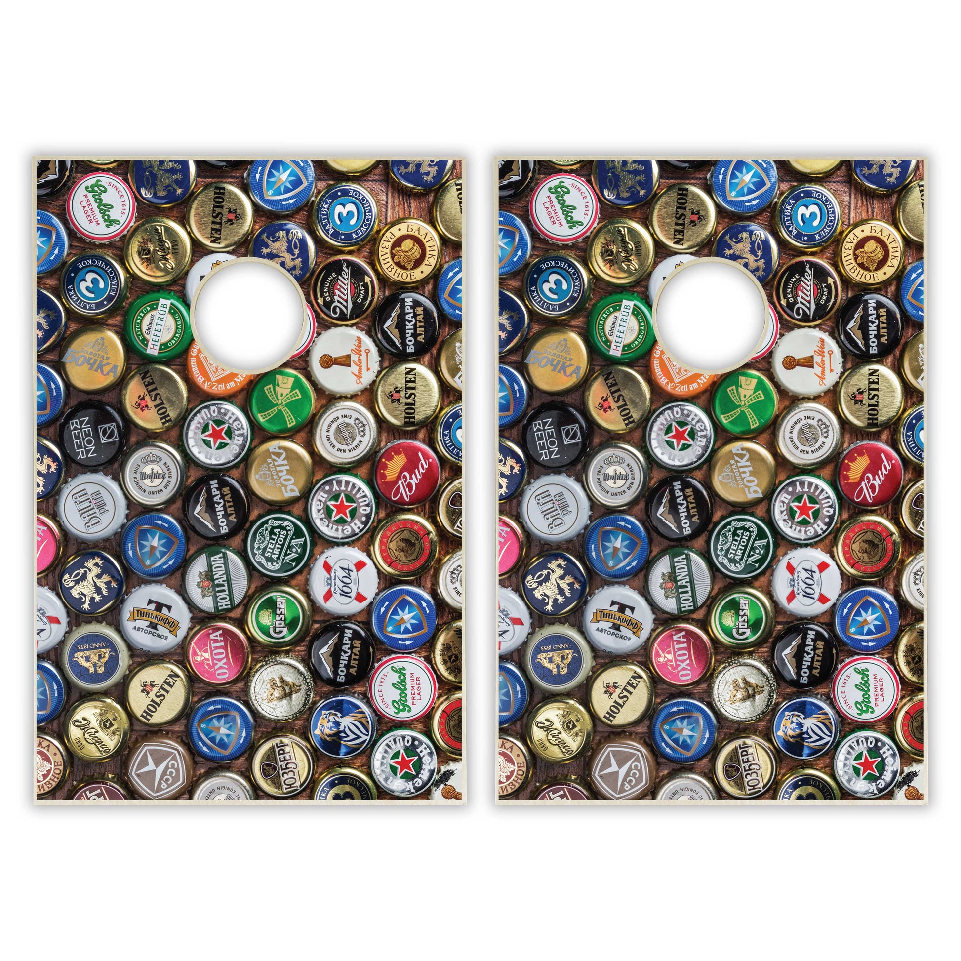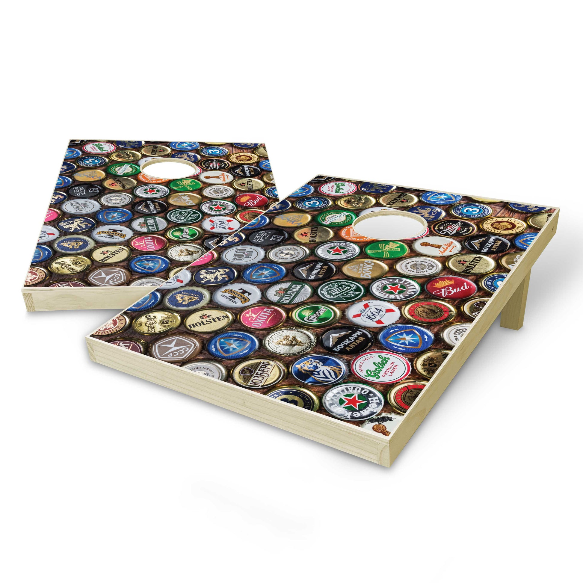 Show off at your next event with this specialty-designed Bottle Caps Cornhole party game set!