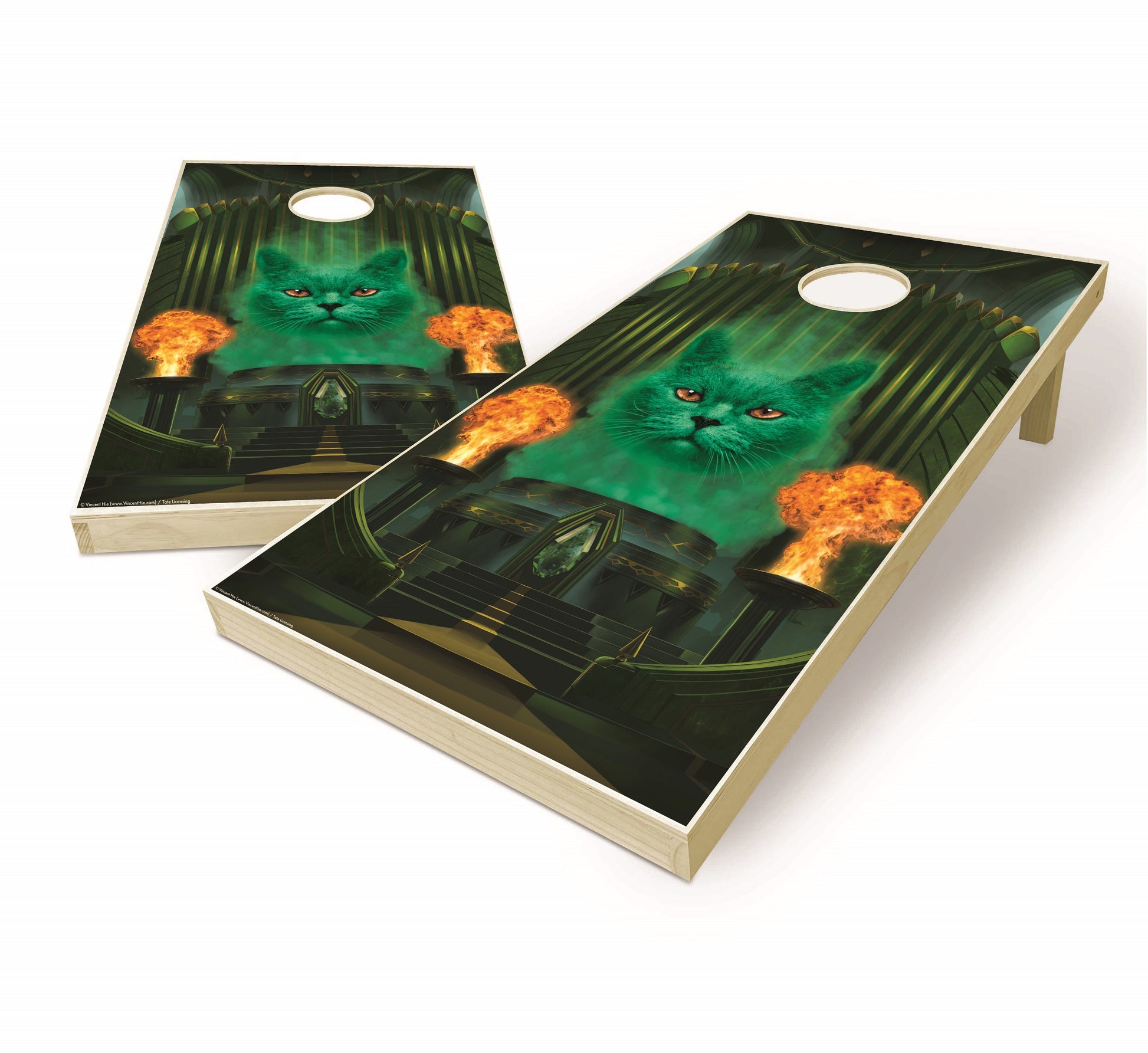 Show off at your next event with this specialty-designed Cat the Great and Powerful Cornhole party game set! These unique boards were created in collaboration with Artist Vincent Hie.
