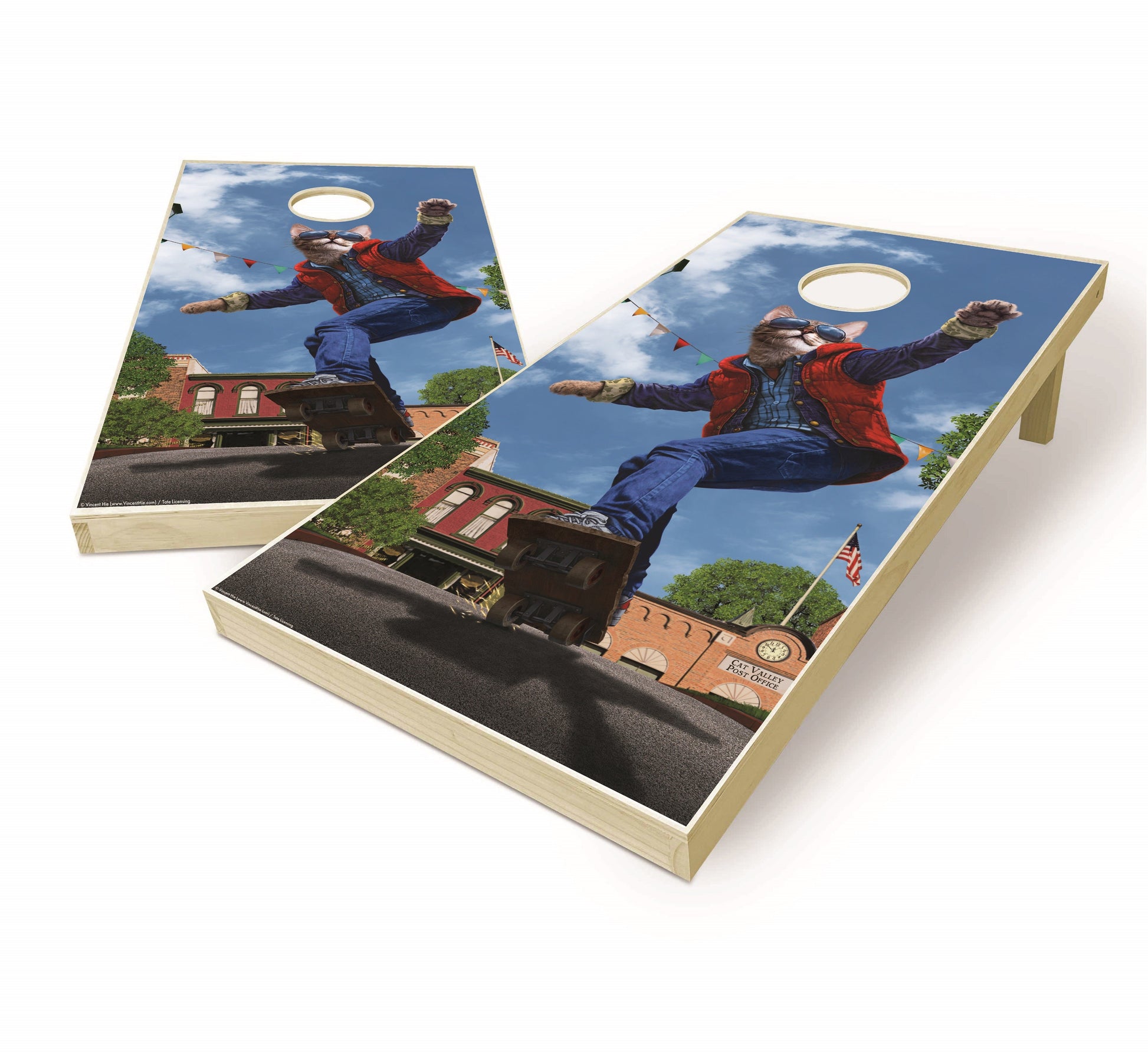 Show off at your next event with this specialty-designed Cat to the Future Cornhole party game set! These unique boards were created in collaboration with Artist Vincent Hie.
