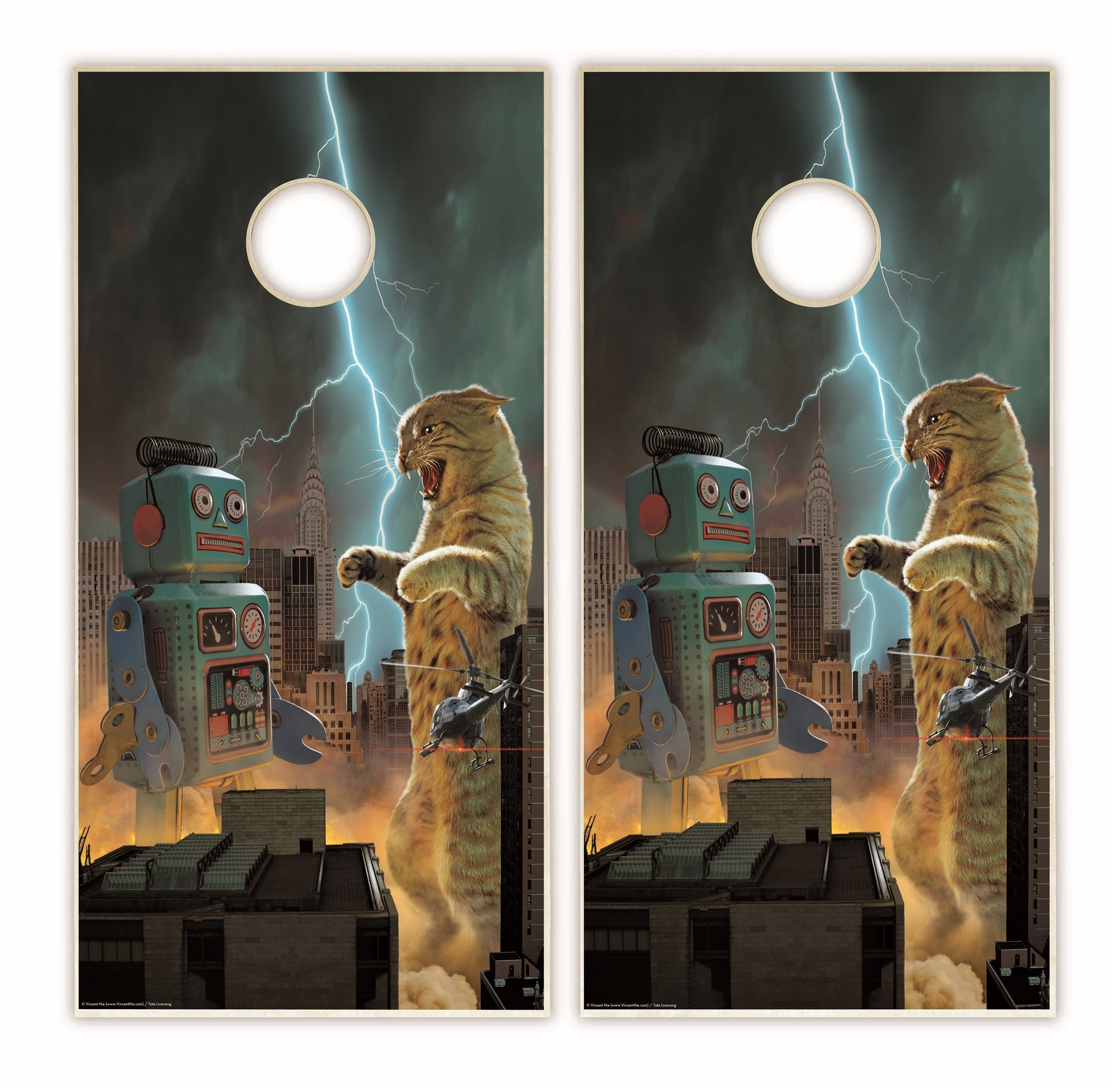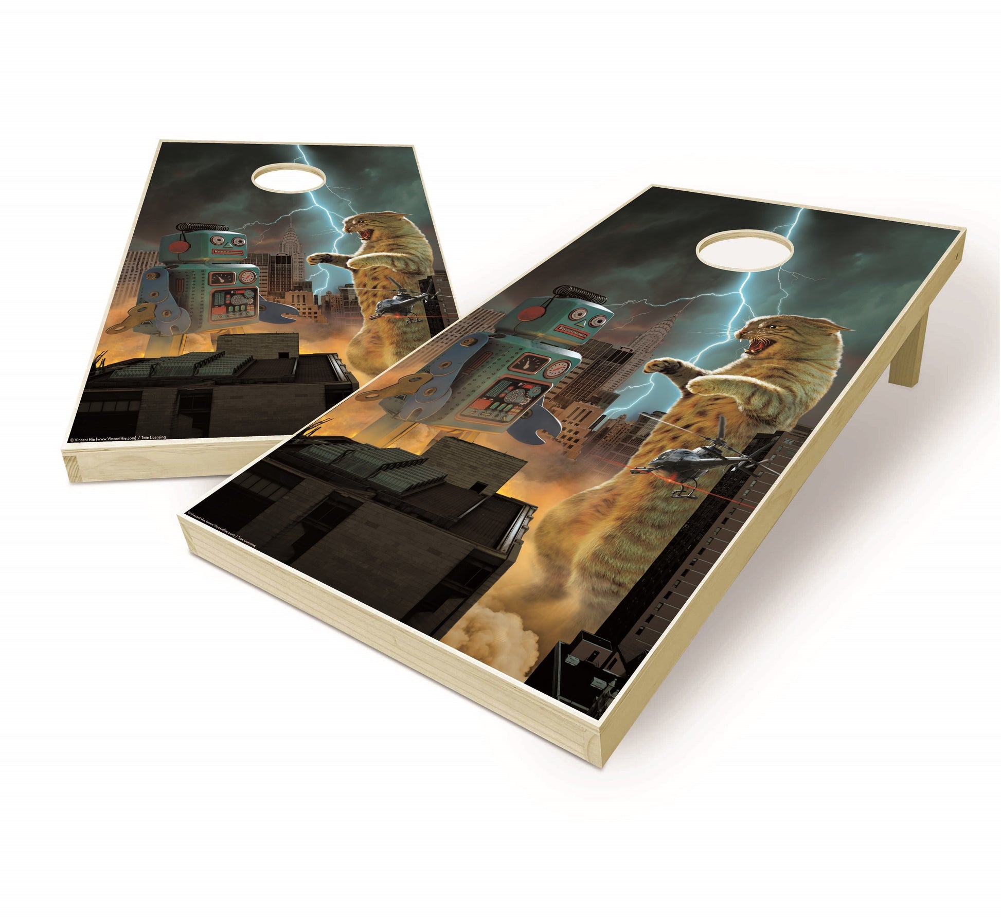 Show off at your next event with this specialty-designed Catzilla Cornhole party game set! These unique boards were created in collaboration with Artist Vincent Hie.