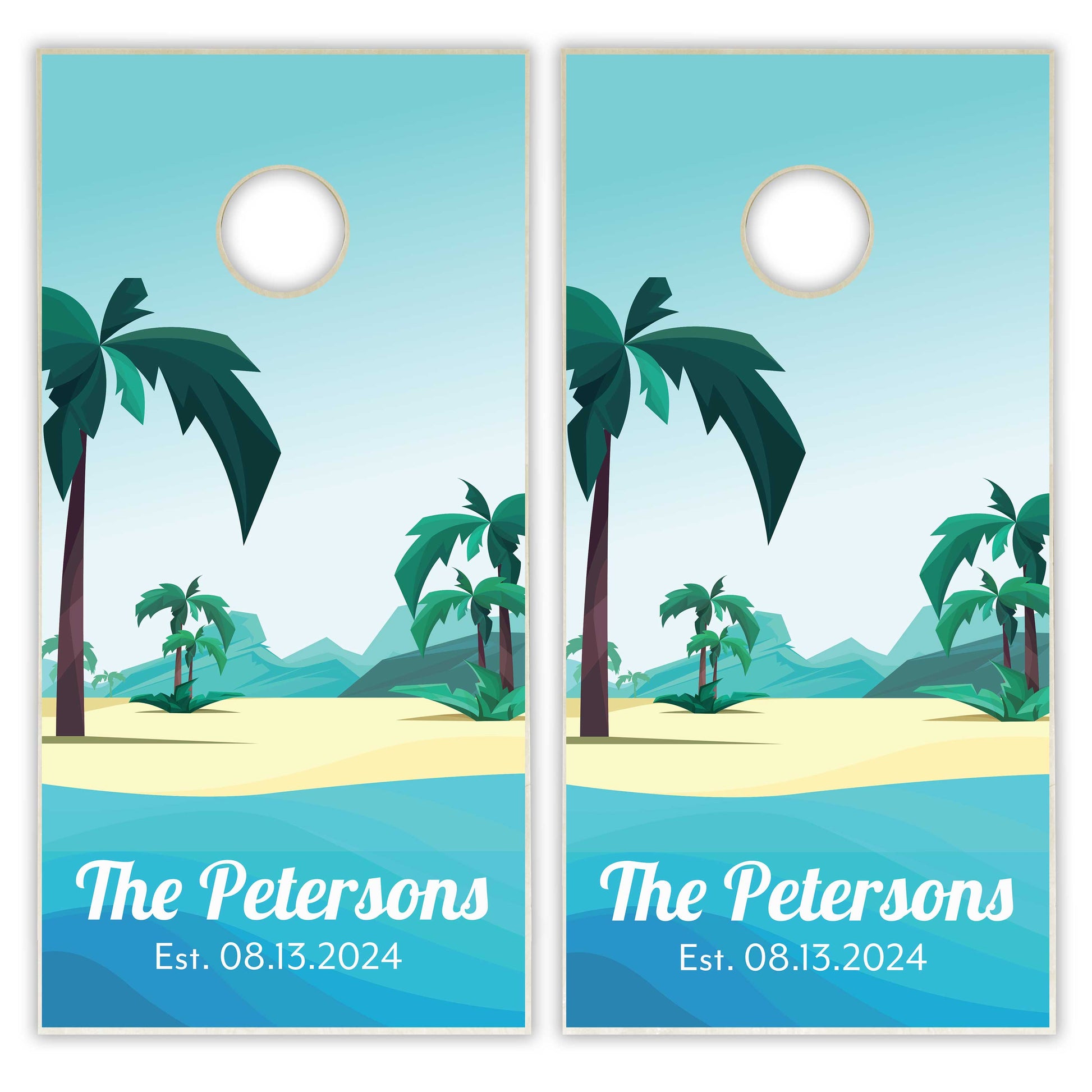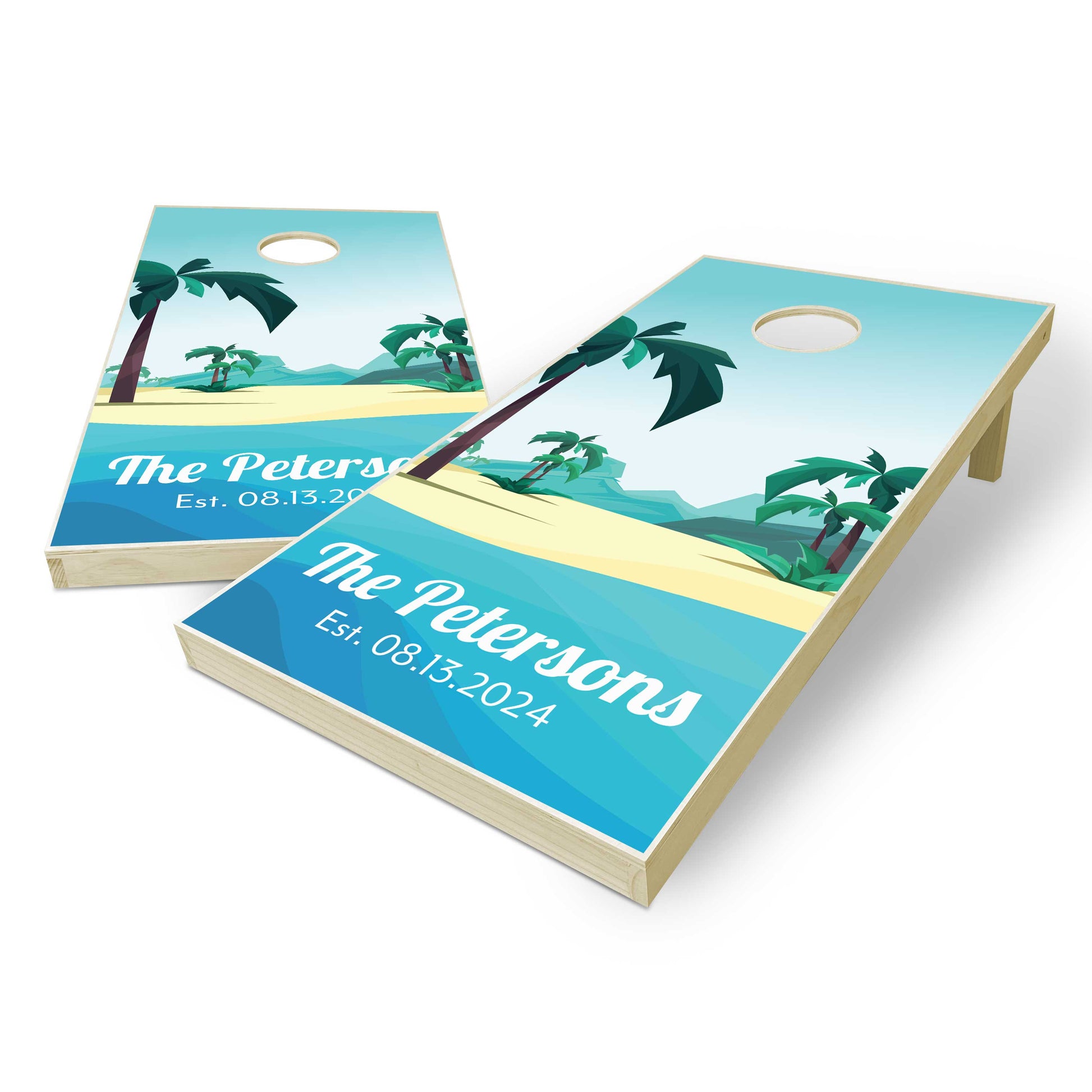Show off at your next event with this specialty-designed Customized Beach Family Cornhole party game set!