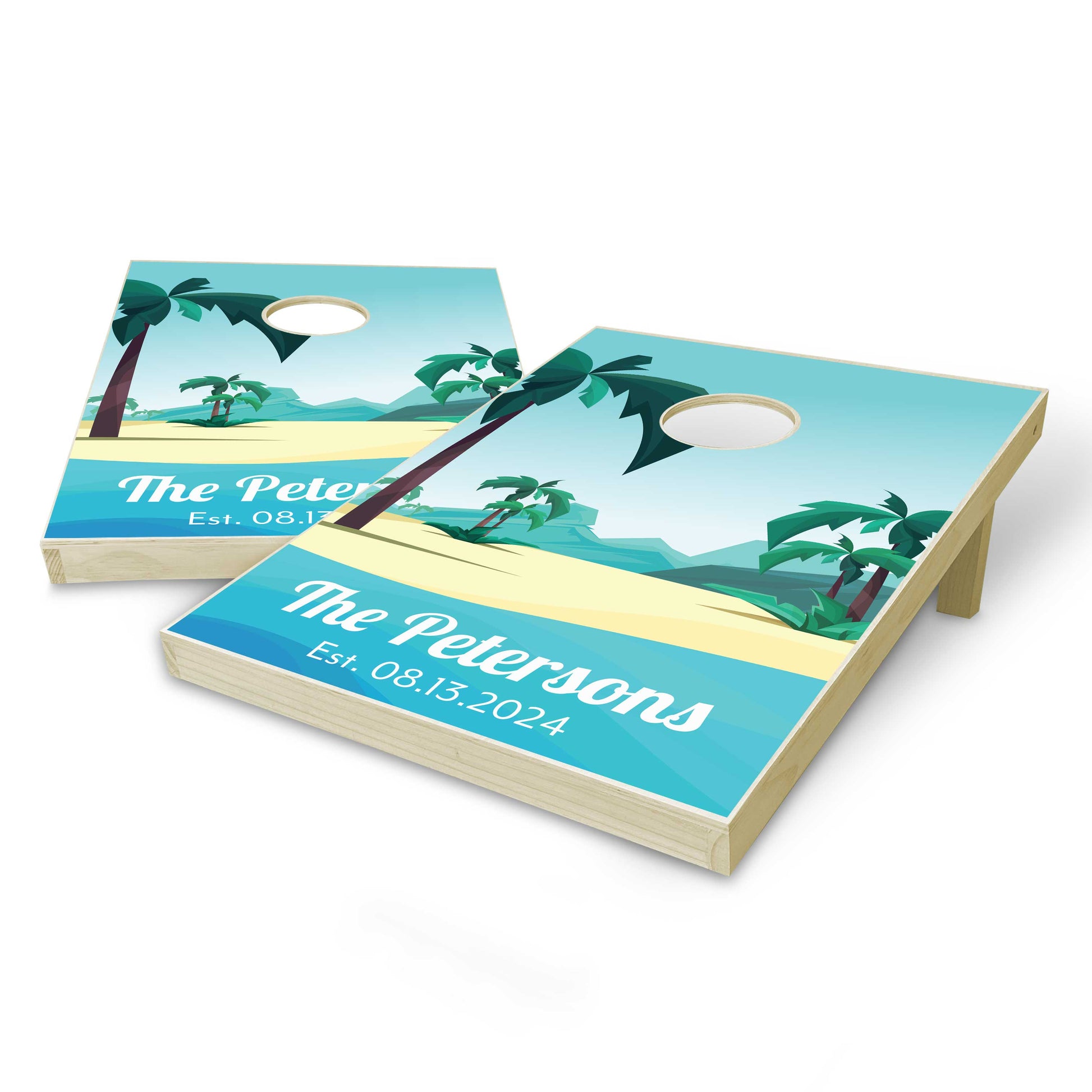 Show off at your next event with this specialty-designed Customized Beach Family Cornhole party game set!