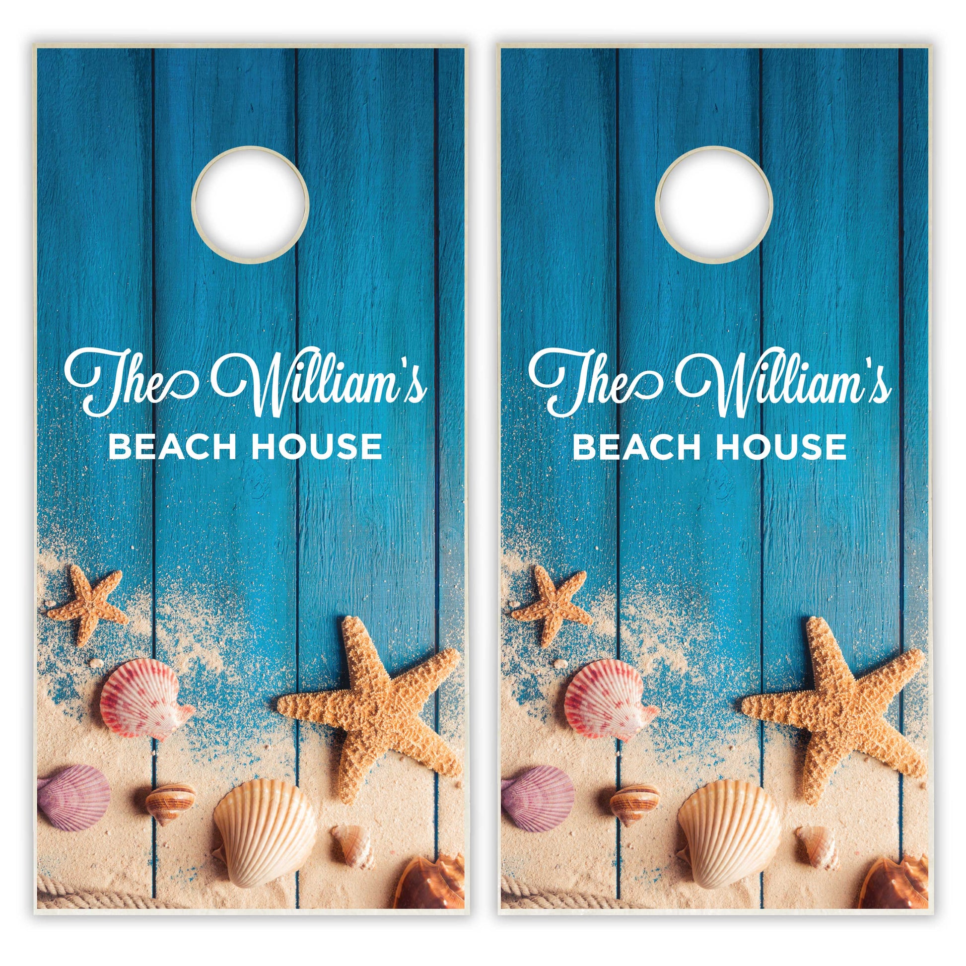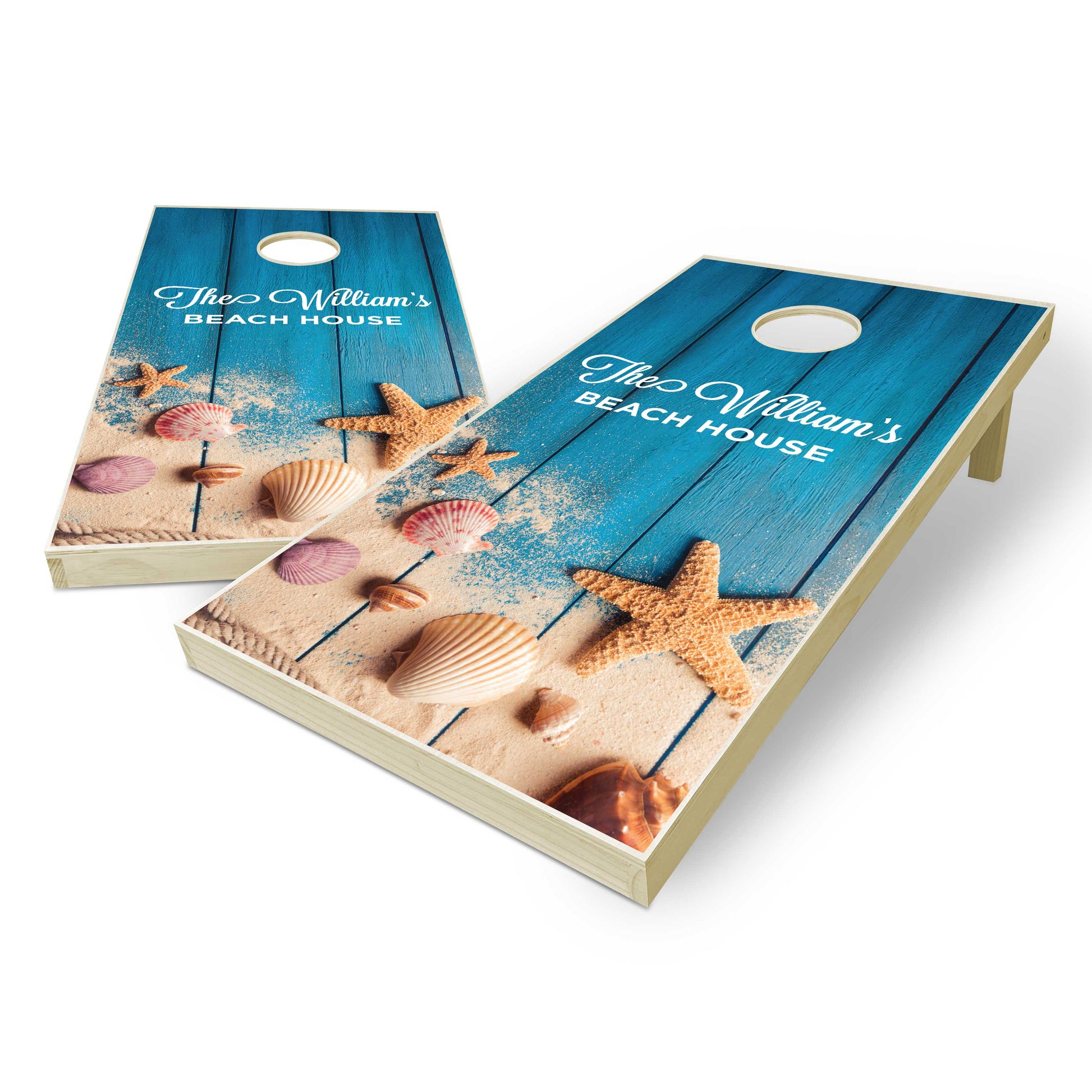Show off at your next event with this specialty-designed Customized Beach House Cornhole party game set!