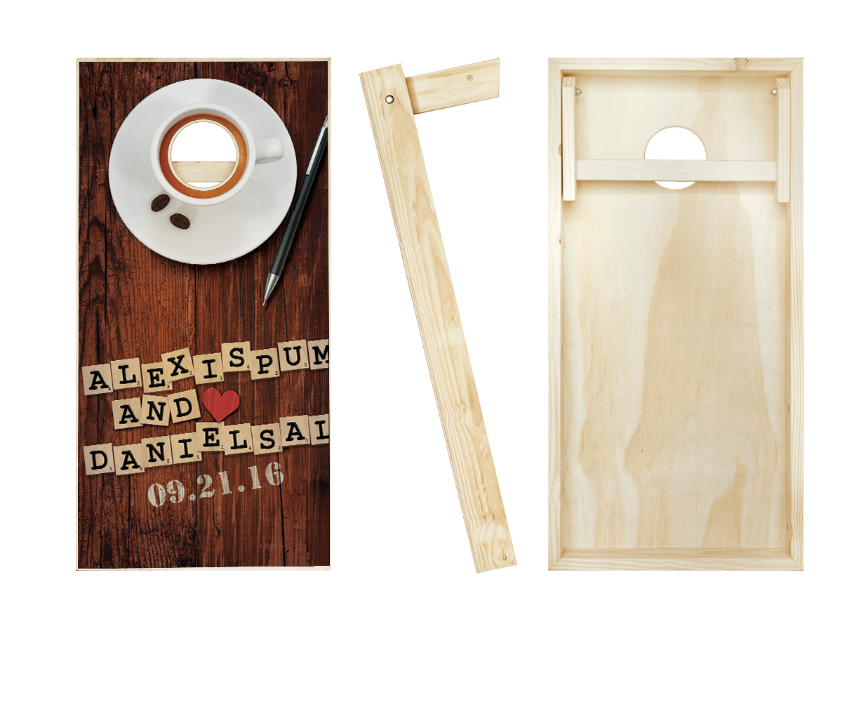 Play cornhole at your reception with this customized cornhole set! The decal is printed vinyl and finished with a clear coat polyurethane to protect your boards for years. This 24"x48" set of cornhole boards comes with folding legs and you can add a full set of 8 standard cornhole bags. The boards are completely sanded for a smooth finish. These boards are made of quality 1/2" plywood and will hold up to anything you throw at them. Great for a BBQ, tailgating, camping, or just a relaxing day in the sun. Our boards are ACA Certified!