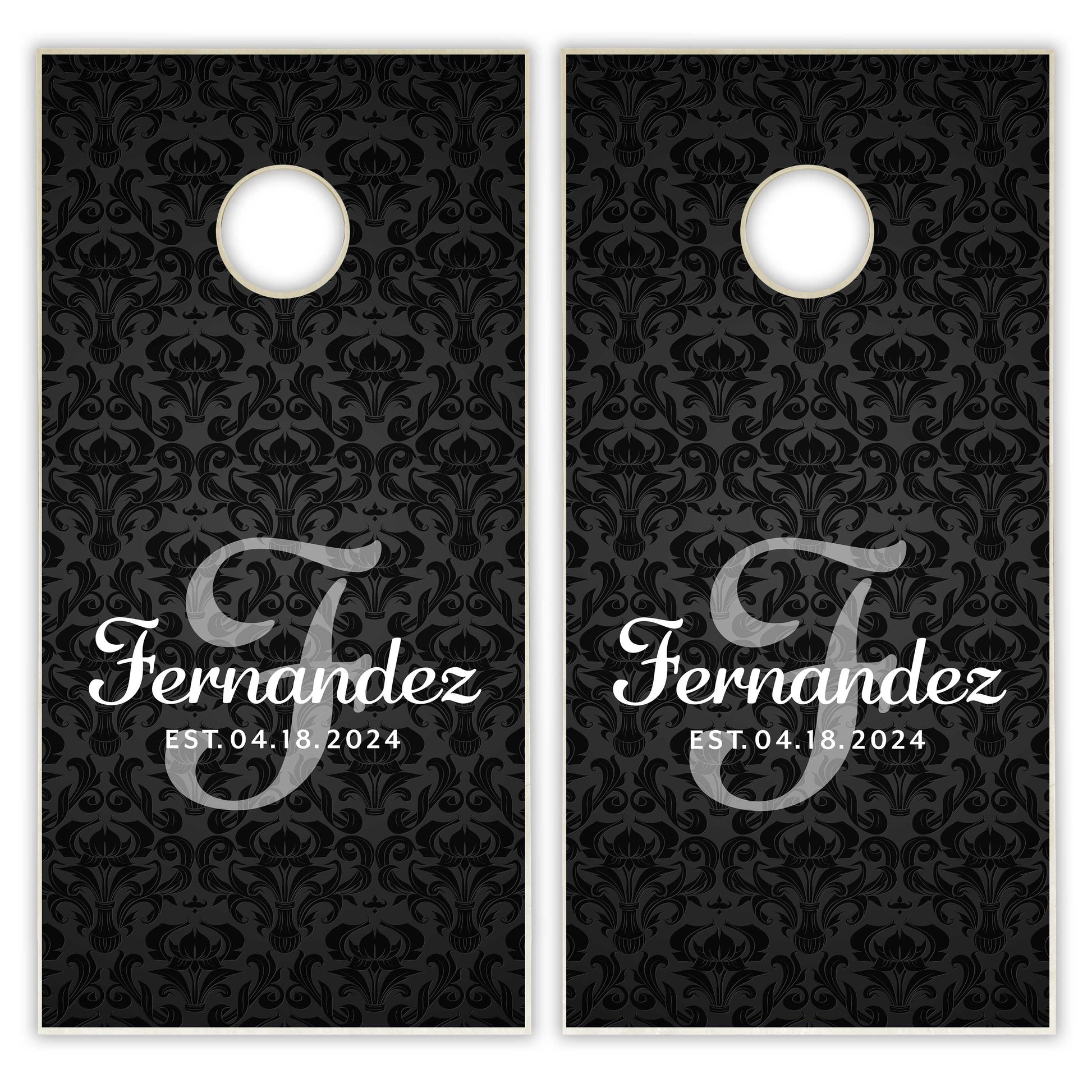 Show off at your next event with this specialty-designed Customized Damask Wedding Cornhole party game set!