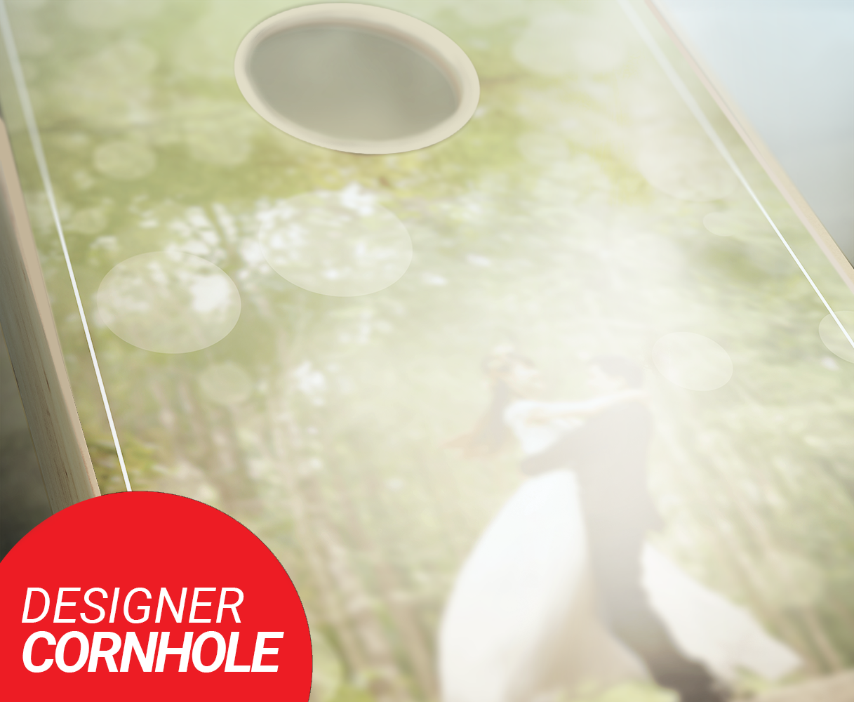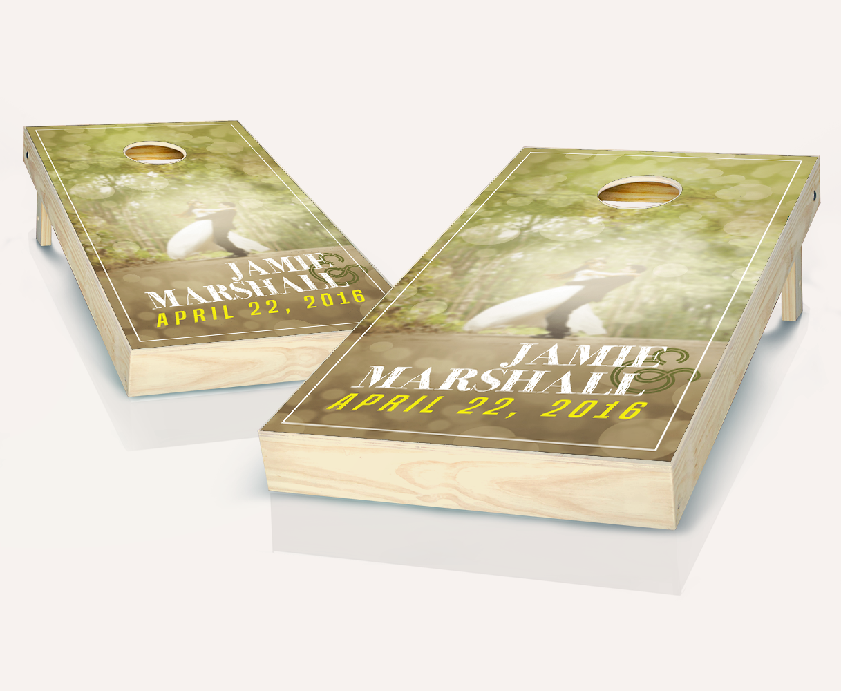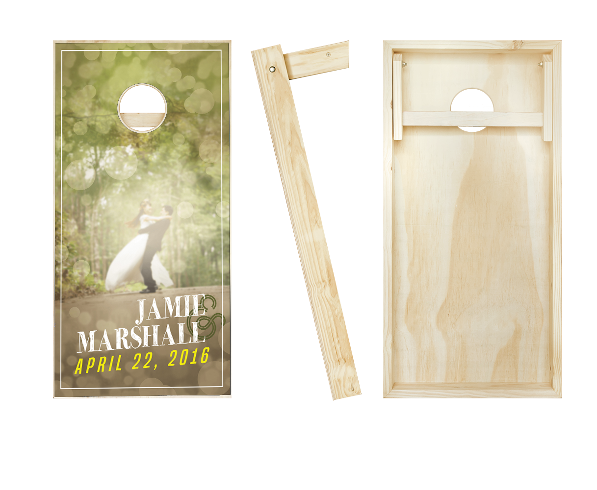 Play cornhole at your reception with this customized cornhole set! The decal is printed vinyl and finished with a clear coat polyurethane to protect your boards for years. This 24"x48" set of cornhole boards comes with folding legs and you can add a full set of 8 standard cornhole bags. The boards are completely sanded for a smooth finish. These boards are made of quality 1/2" plywood and will hold up to anything you throw at them. Great for a BBQ, tailgating, camping, or just a relaxing day in the sun. Our boards are ACA Certified!