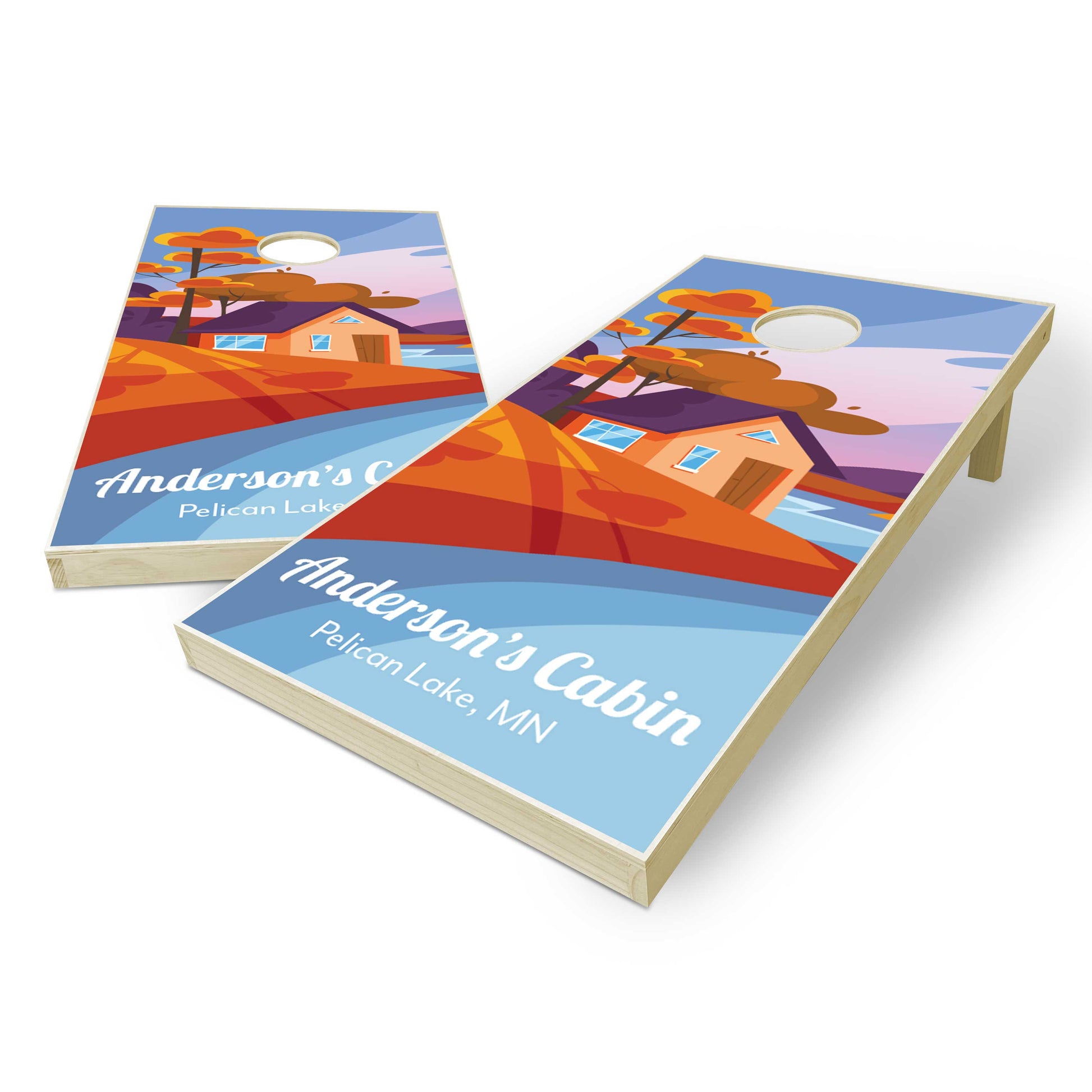 Show off at your next event with this specialty-designed Customized Family Cabin Cornhole party game set!