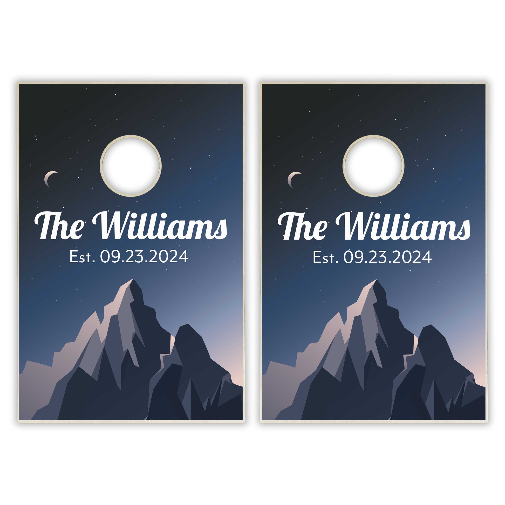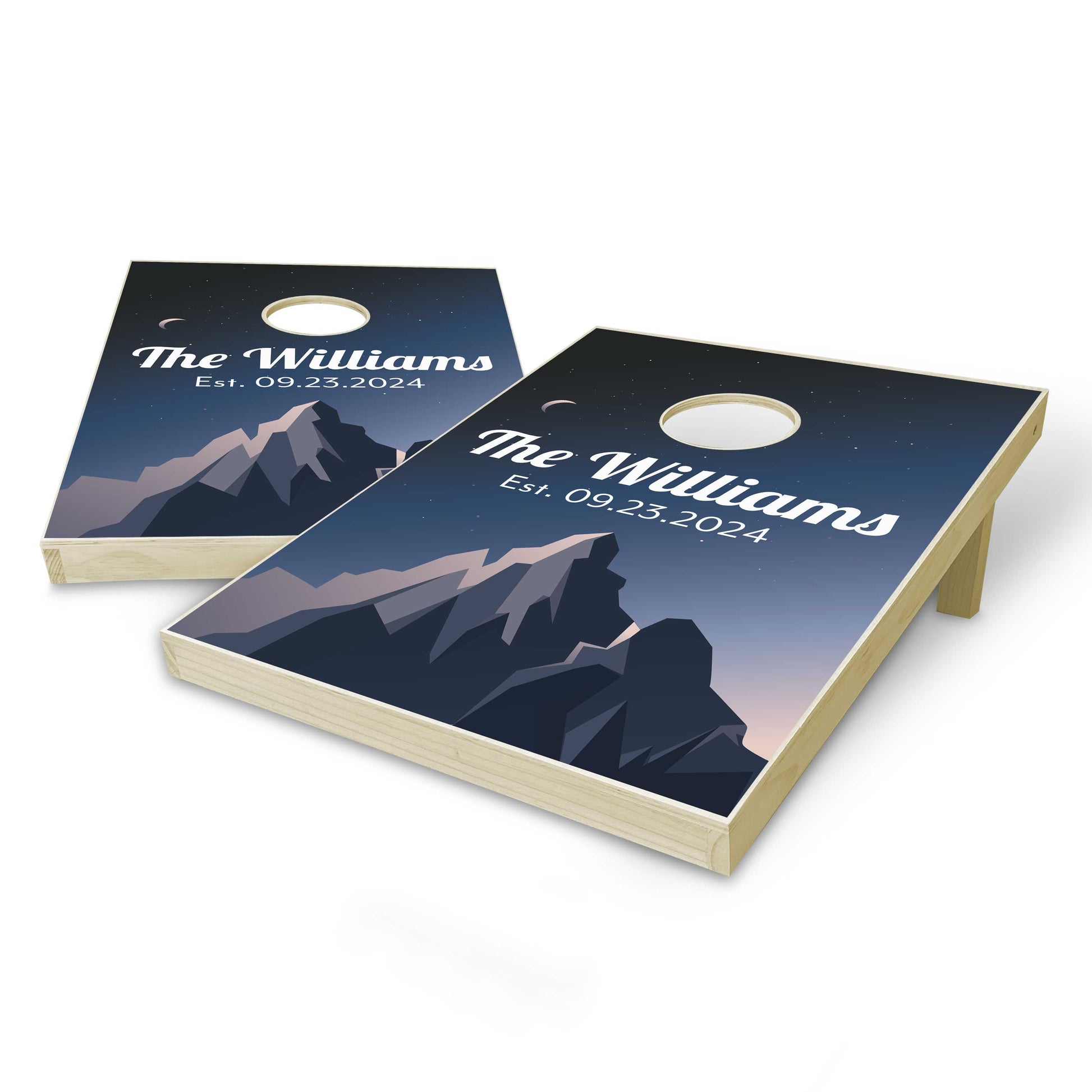 Show off at your next event with this specialty-designed Customized Family Name Mountain Cornhole party game set!