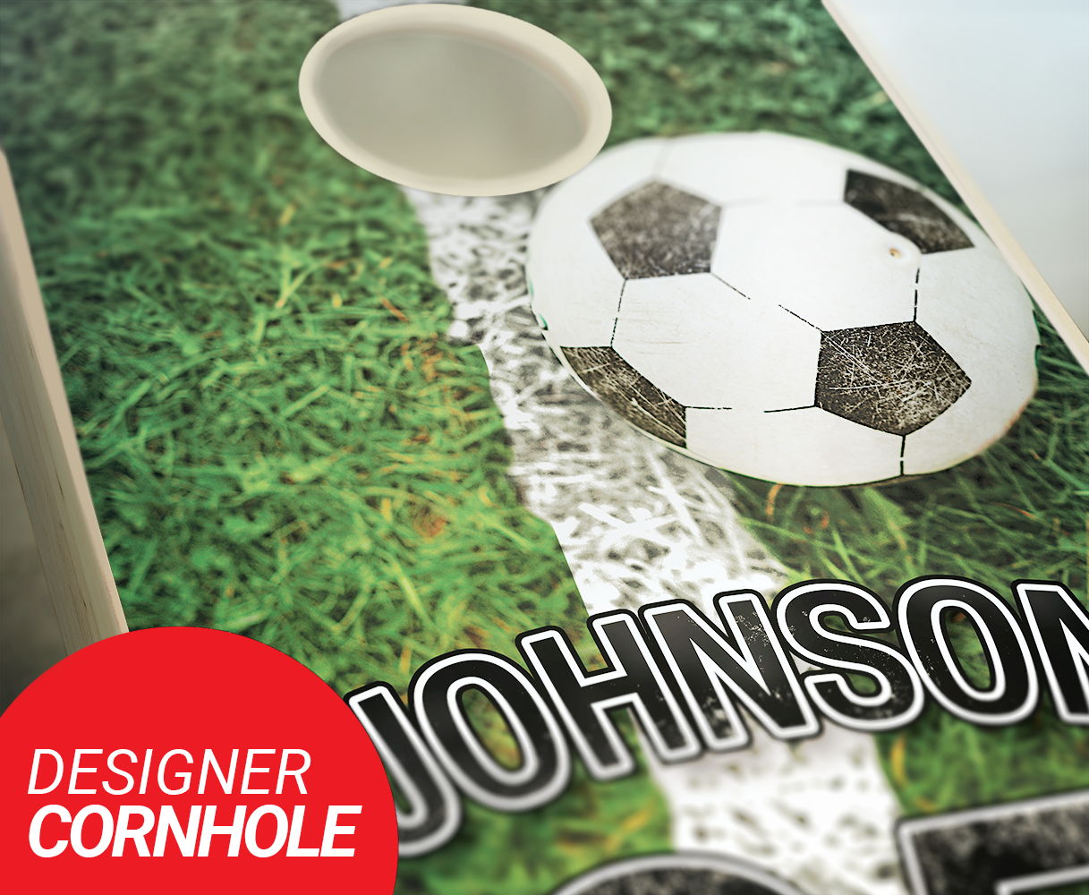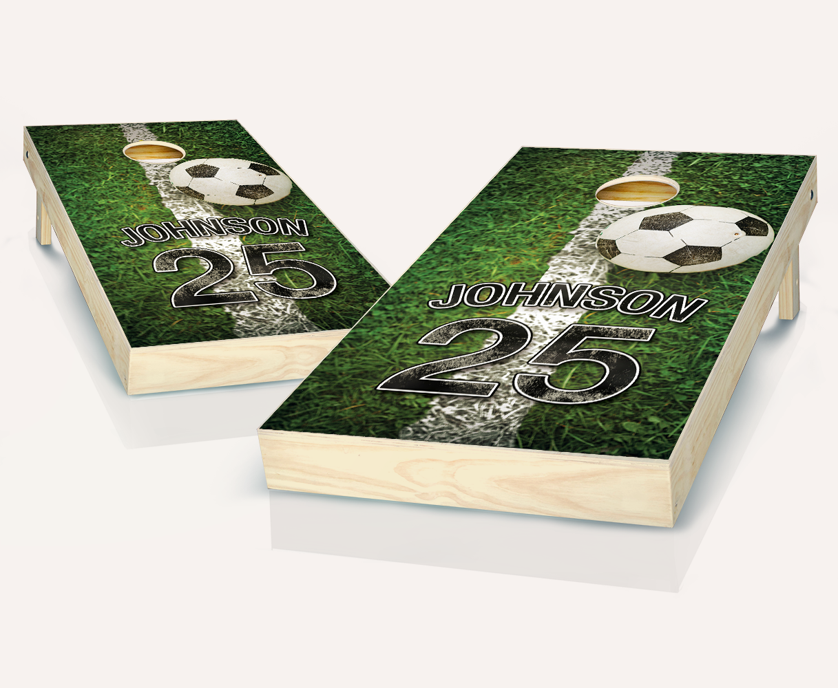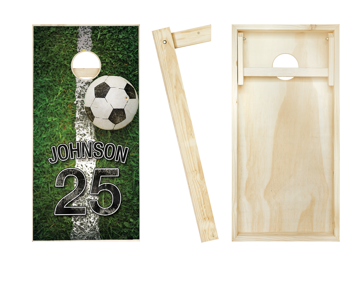 Show off at your next event with this soccer cornhole set! The decal is printed vinyl and finished with a clear coat polyurethane to protect your boards for years. This 24"x48" set of cornhole boards comes with folding legs and you can add a full set of 8 standard cornhole bags. The boards are completely sanded for a smooth finish. These soccer cornhole boards are made of quality 1/2" plywood and will hold up to anything you throw at them. Our bean bag throwing games are great for a BBQ, tailgating, camping, or just a relaxing day in the sun. Our boards are ACA Certified!
