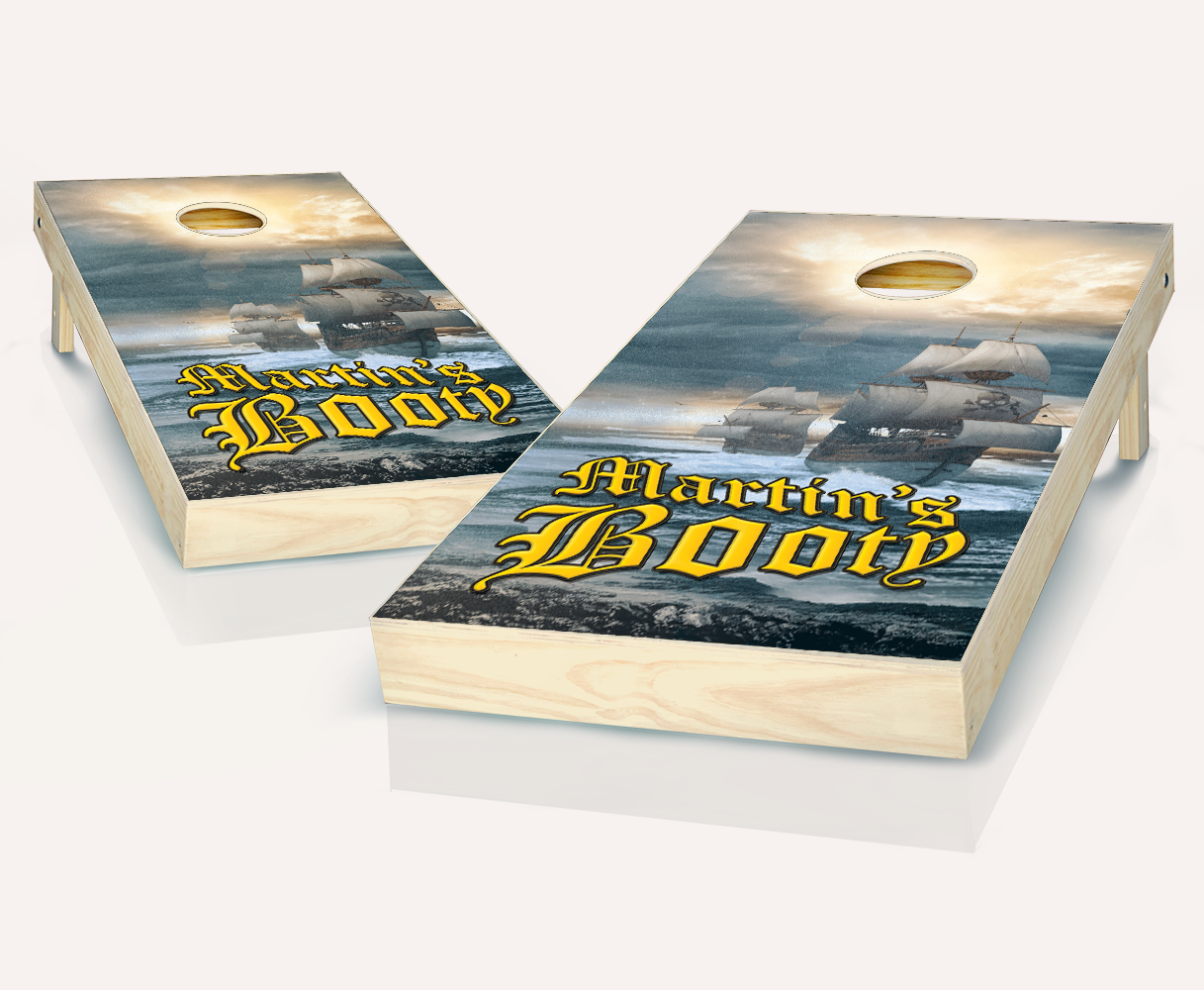 Show off at your next event with this specialty designed cornhole set! The decal is printed vinyl and finished with a clear coat polyurethane to protect your boards for years. This 24"x48" set of cornhole boards comes with folding legs and you can add a full set of 8 standard cornhole bags. The boards are completely sanded for a smooth finish. These boards are made of quality 1/2" plywood and will hold up to anything you throw at them. Great for a BBQ, tailgating, camping, or just a relaxing day in the sun. Our boards are ACA Certified!
