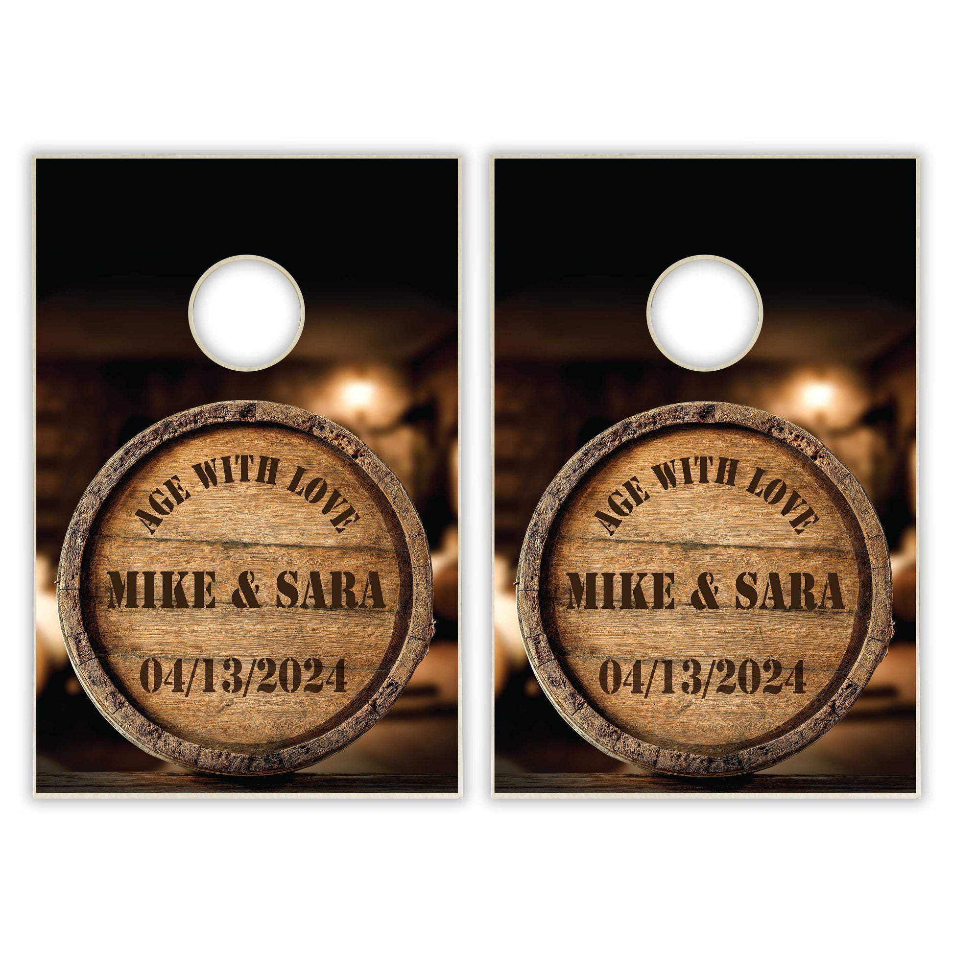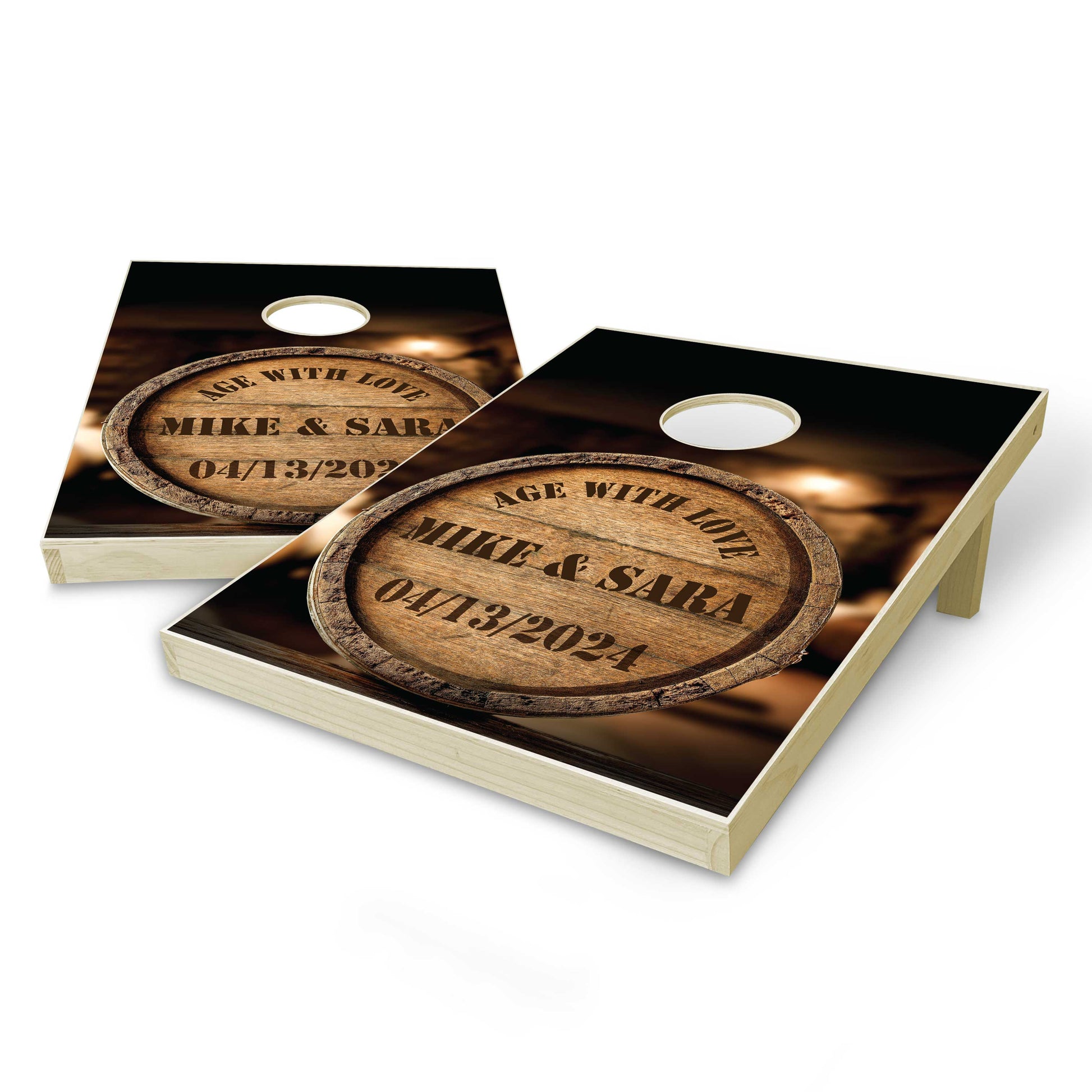 Show off at your next event with this specialty-designed Customized Whiskey Barrel Cornhole party game set!