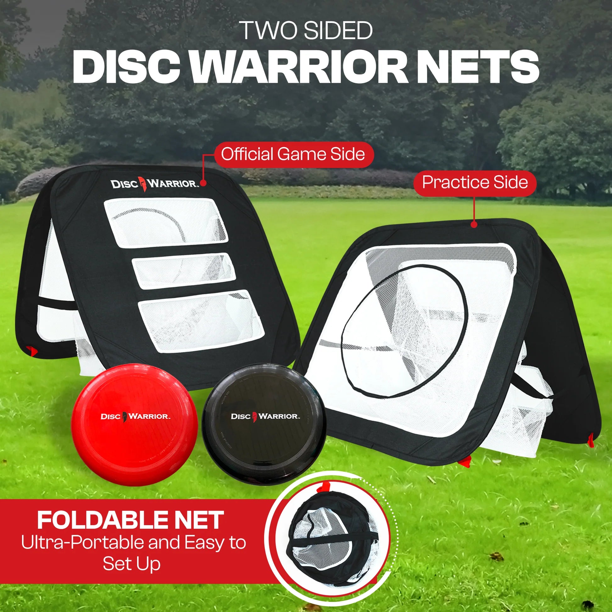 Two-Sided Disc Warrior Net features an Official Game Side and Practice Side. The Practice Side of the net features a 15-inch hole that is great for: solo practice, trick shots, Ultimate Frisbee target practice, Disc Golf target practice, and is perfect for young kids who are just learning how to throw a disc.