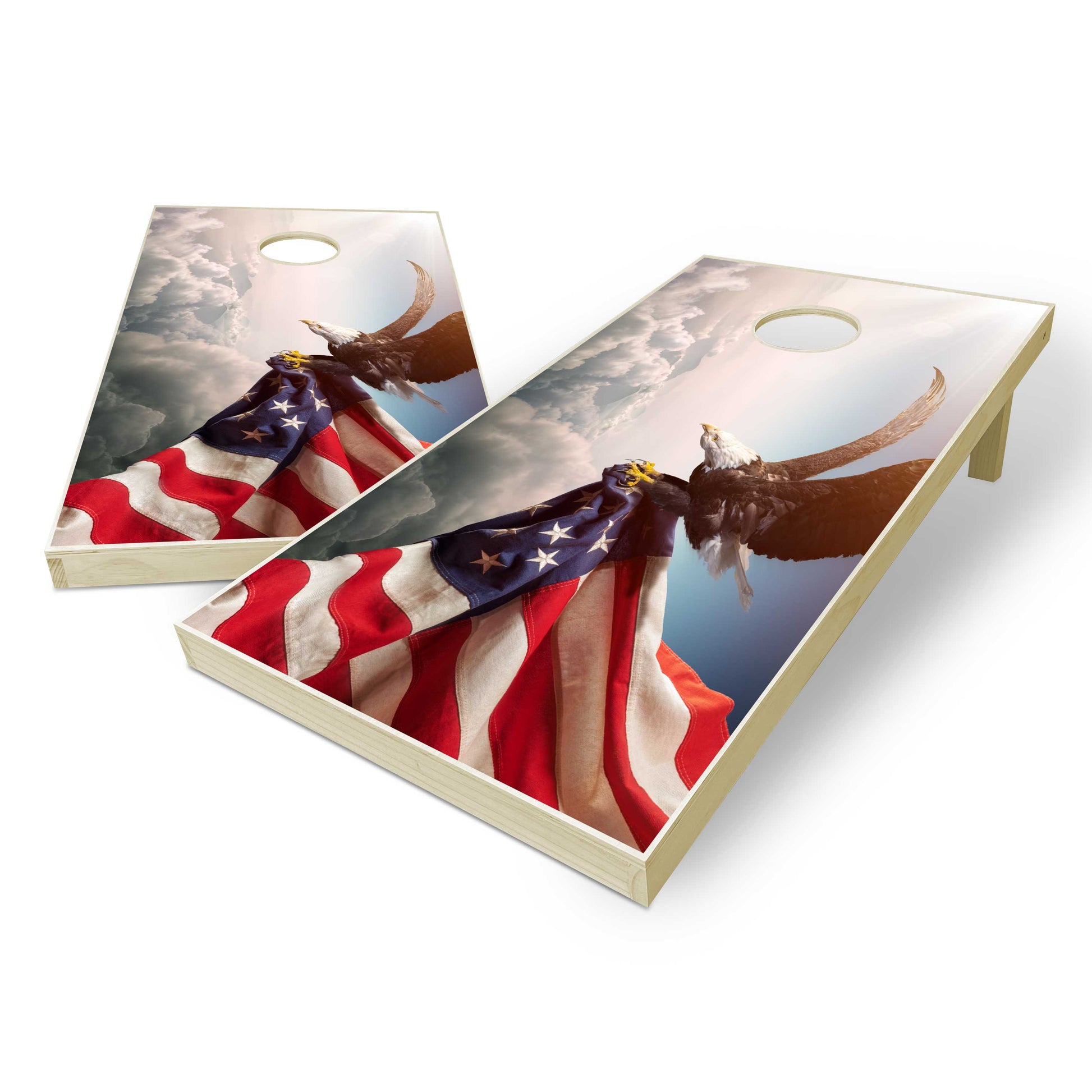 - 2 Regulation Size (24" x 48") Cornhole Boards with printed vinyl eagle and flag decals