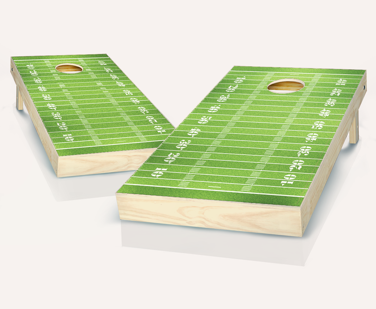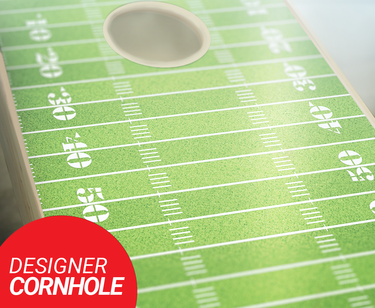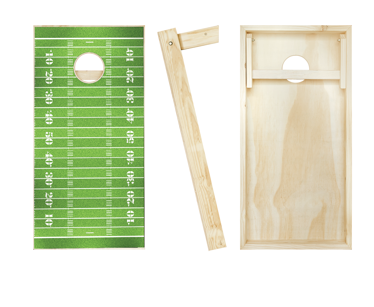 Show off at your next event with this football field bean bag toss game set! The decal is printed vinyl and finished with a clear coat polyurethane to protect your boards for years. This 24"x48" set of cornhole boards comes with folding legs and you can add a full set of 8 standard cornhole bags. The boards are completely sanded for a smooth finish. These boards are made of quality 1/2" plywood and will hold up to anything you throw at them. Our football field bean bag toss game set is fun to set up at BBQs, tailgates, campsites, or just a relaxing day on the beach. Our boards are ACA Certified!