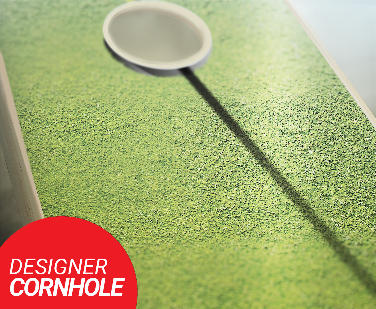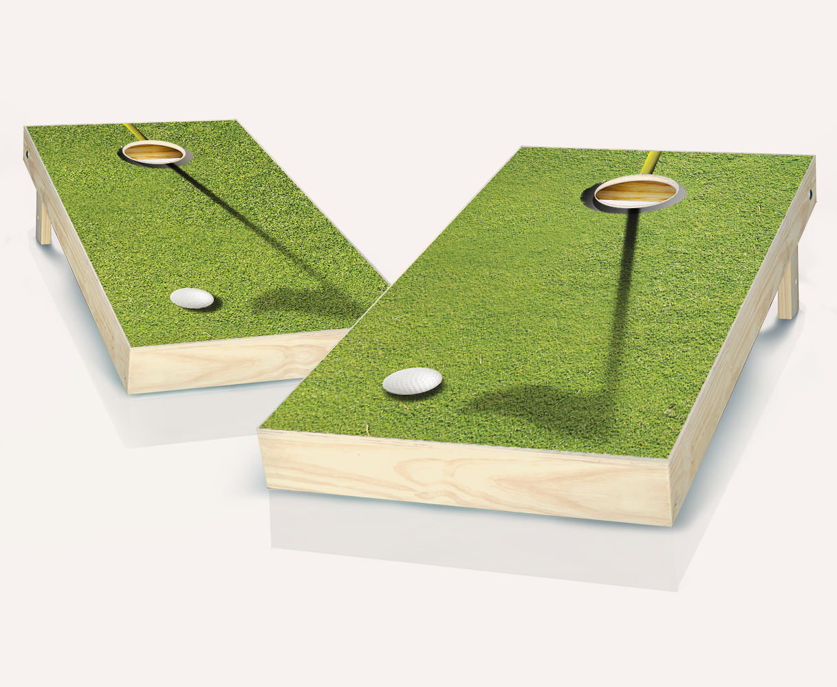 Show off at your next event with this specialty golf theme cornhole set! The decal is printed vinyl and finished with a clear coat polyurethane to protect your boards for years. This 24"x48" set of golf theme cornhole boards comes with folding legs and you can add a full set of 8 standard cornhole bags. The boards are completely sanded for a smooth finish. These boards are made of quality 1/2" plywood and will hold up to anything you throw at them. Great for a golf gift for him, BBQ get-togethers, tailgating, camping, or just a relaxing day in the sun. Our boards are ACA Certified!