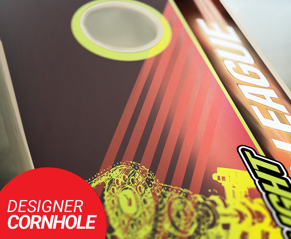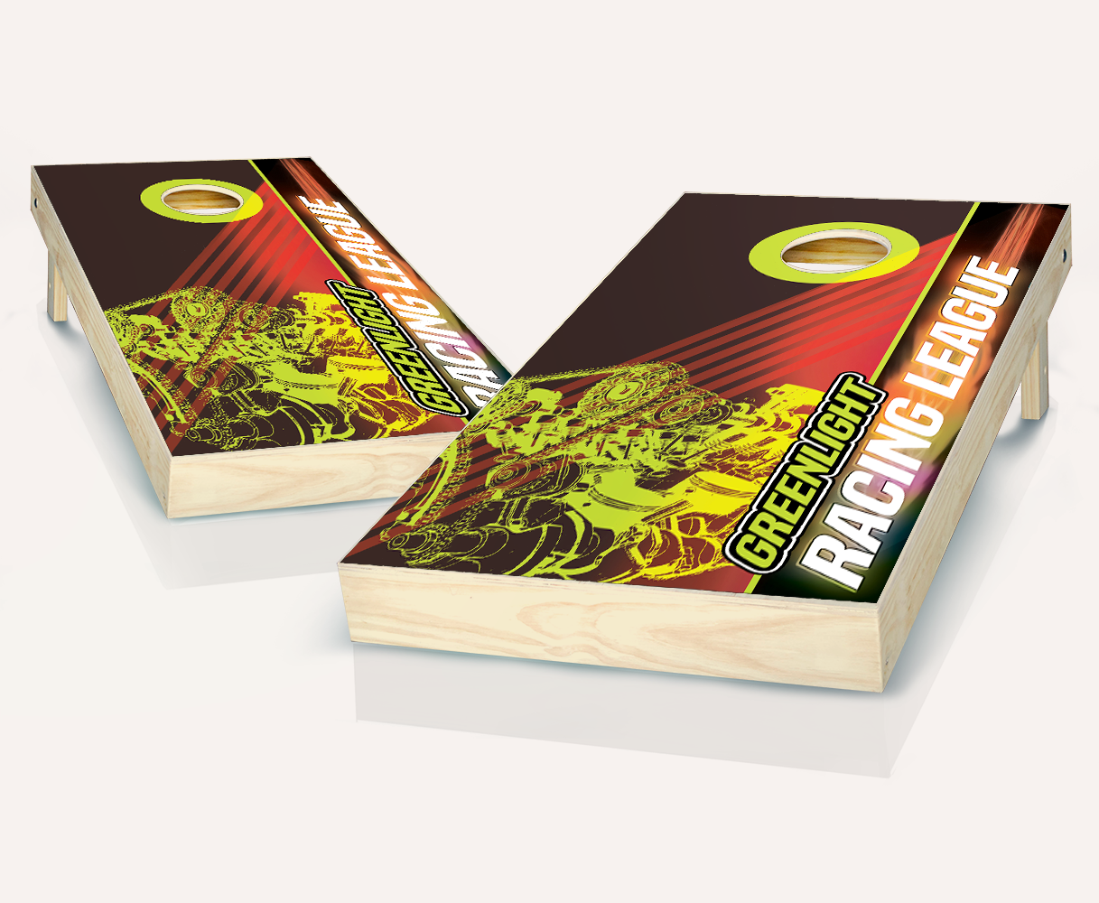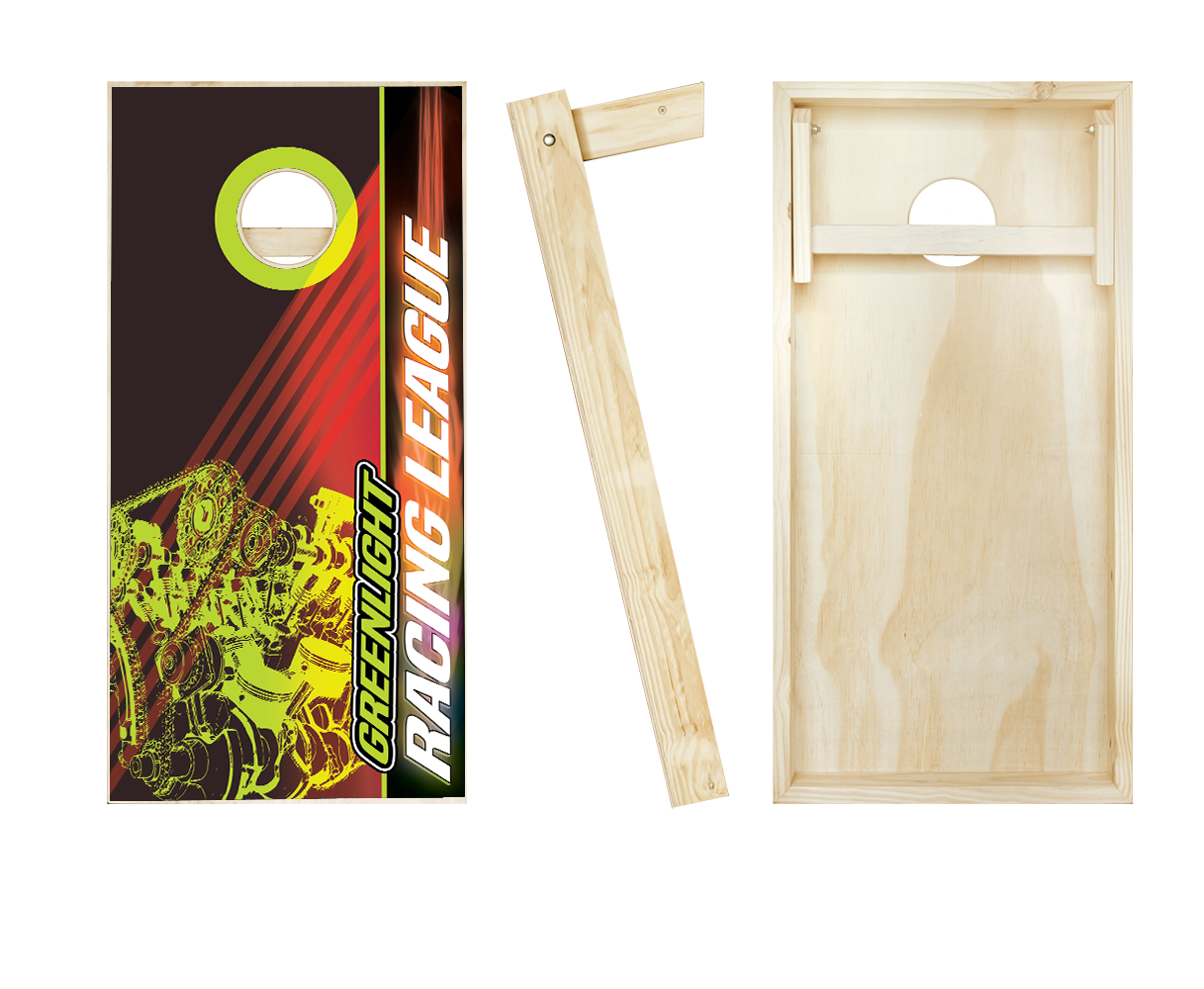 Show off at your next event with these specialty racing cornhole boards! The decal is printed vinyl and finished with a clear coat polyurethane to protect your boards for years. This 24"x48" set of cornhole boards comes with folding legs and you can add a full set of 8 standard cornhole bags. The boards are completely sanded for a smooth finish. Our racing cornhole boards are made of quality 1/2" plywood and will hold up to anything you throw at them. Great for a BBQ, tailgating, camping, or just a relaxing day in the sun. Our boards are ACA Certified!