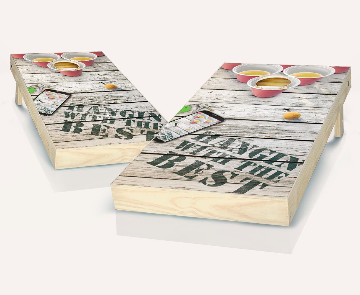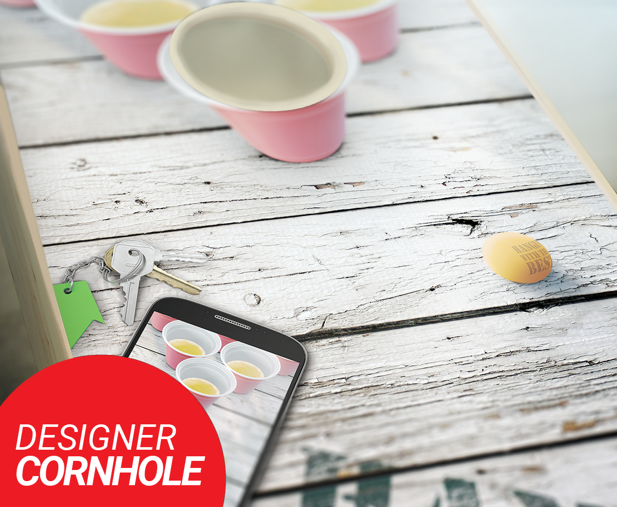 Show off at your next event with this specialty designed beer pong cornhole set! The decal is printed vinyl and finished with a clear coat polyurethane to protect your boards for years. This 24"x48" set of beer pong cornhole boards comes with folding legs and you can add a full set of 8 standard cornhole bags. The boards are completely sanded for a smooth finish. These boards are made of quality 1/2" plywood and will hold up to anything you throw at them. Great for a BBQ, tailgating, camping, or just a relaxing day in the sun. Our beer pong cornhole boards are ACA Certified!