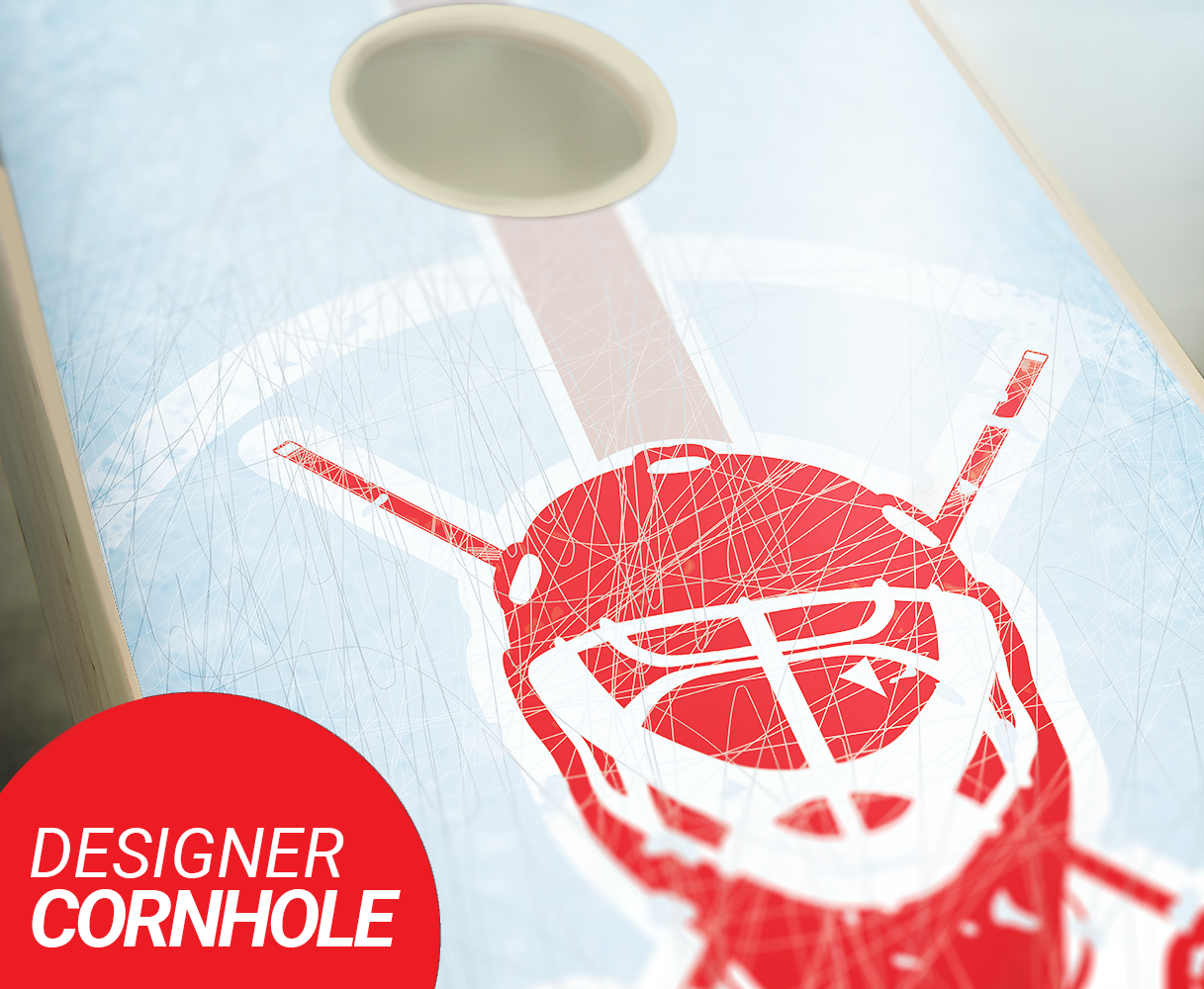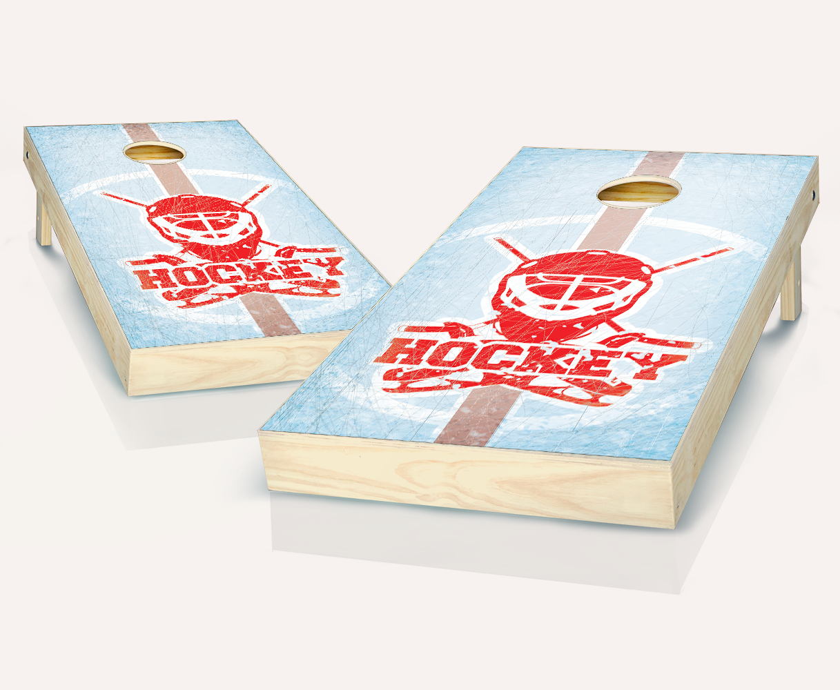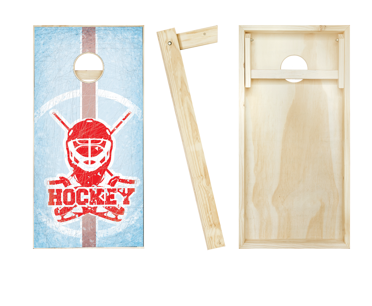 Show off at your next event with these hockey stick cornhole boards! The decal is printed vinyl and finished with a clear coat polyurethane to protect your boards for years. This 24"x48" set of cornhole boards comes with folding legs and you can add a full set of 8 standard cornhole bags. The boards are completely sanded for a smooth finish. In this ice hockey cornhole theme set, the boards are made of quality 1/2" plywood and will hold up to anything you throw at them. Great for a BBQ, tailgating, camping, or just a relaxing day in the sun. Our boards are ACA Certified!