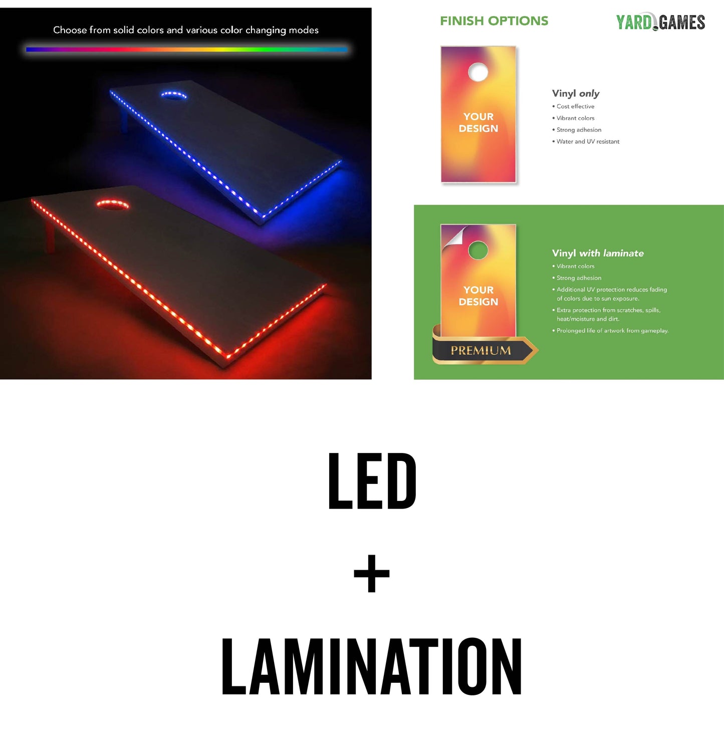 Add LED lights around the perimeter of your boards and in the hole! The LED lights include rope lighting that is inlaid into the wood and can be set to any color and various color changing modes. Keep playing when the sun goes down with this unique addition!