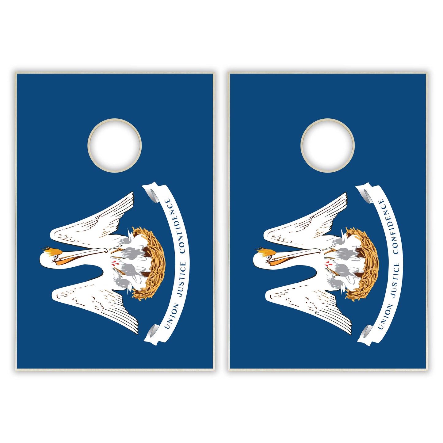 - 2 Regulation Size (24" x 36") Cornhole Boards with Louisiana Flag printed vinyl decals