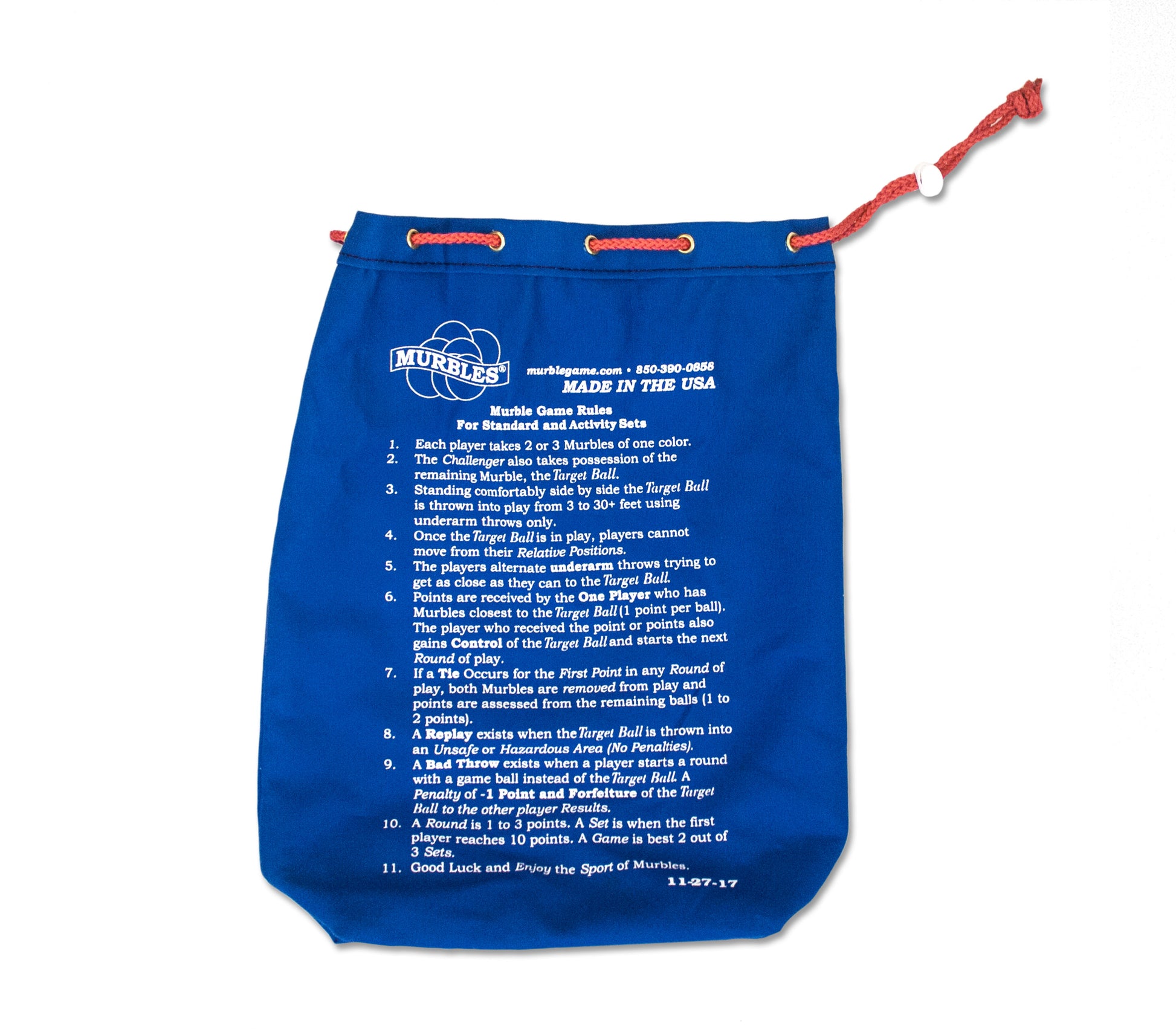 The standard Murble set is designed for 2 players, 4 if you alternate players like when playing Horseshoes. Murbles are sized right so smaller hands and older shoulders can both enjoy playing the game. The 7-Ball Murbles game is made for players 8 years old and up. Murbles come in an array of school colors and have a matching heavy duty canvas drawstring bag with the game rules permanently printed right on the back of the bag.