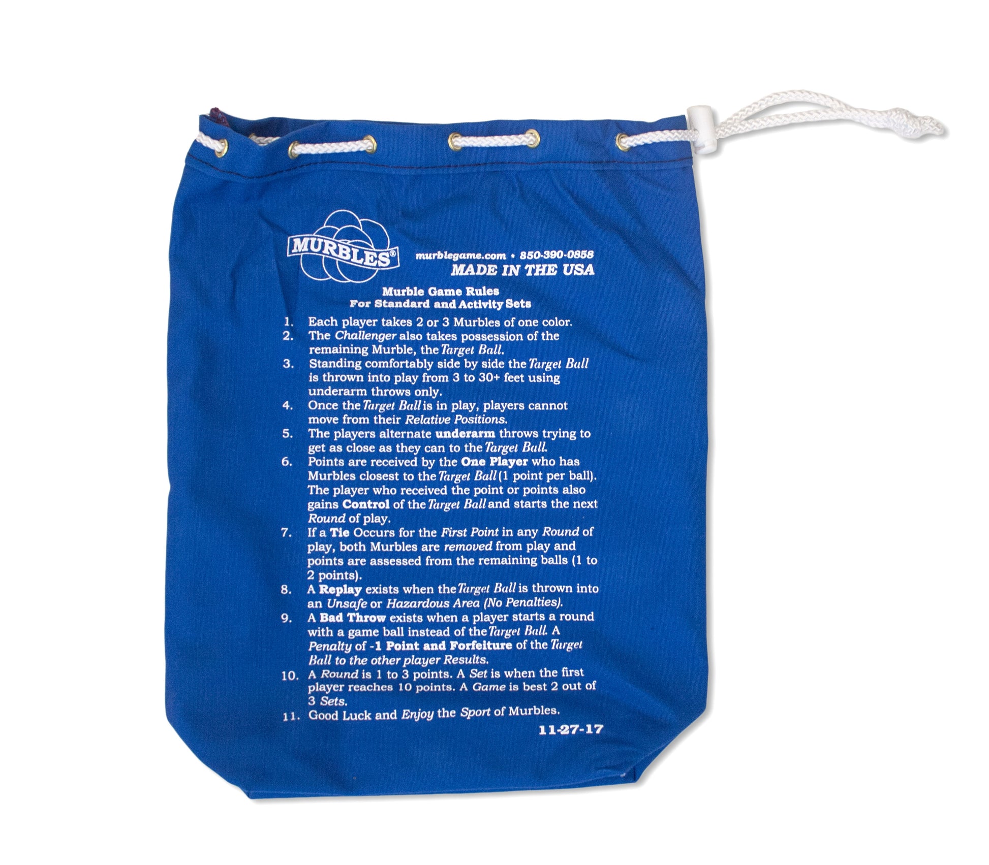 Murbles are easy to play, easy to see and easy to score. Simply toss the point ball into play, then alternate turns trying to get your game balls as close as you can to the point ball. The player with one or more Murbles closest to the point ball wins the points. It is just that easy! As a travel Bocce Ball set, there is no court required or nothing to set up, just dump the balls out of the canvas Murble bag and you're in the game. To make the game more changeling, use the obstacles in the terrain to your advantage.