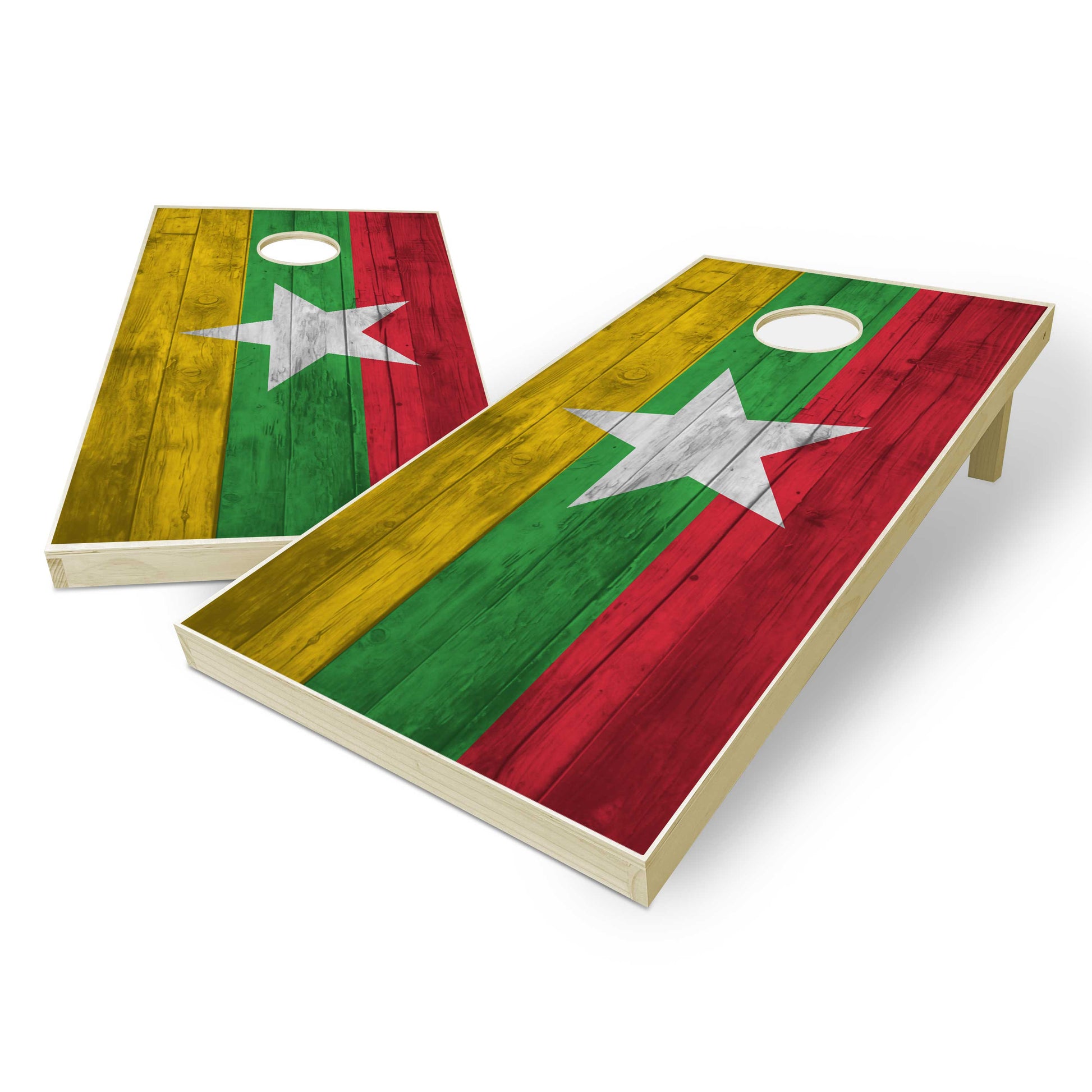 Show off at your next event with this specialty-designed Myanmar Flag Cornhole party game set!