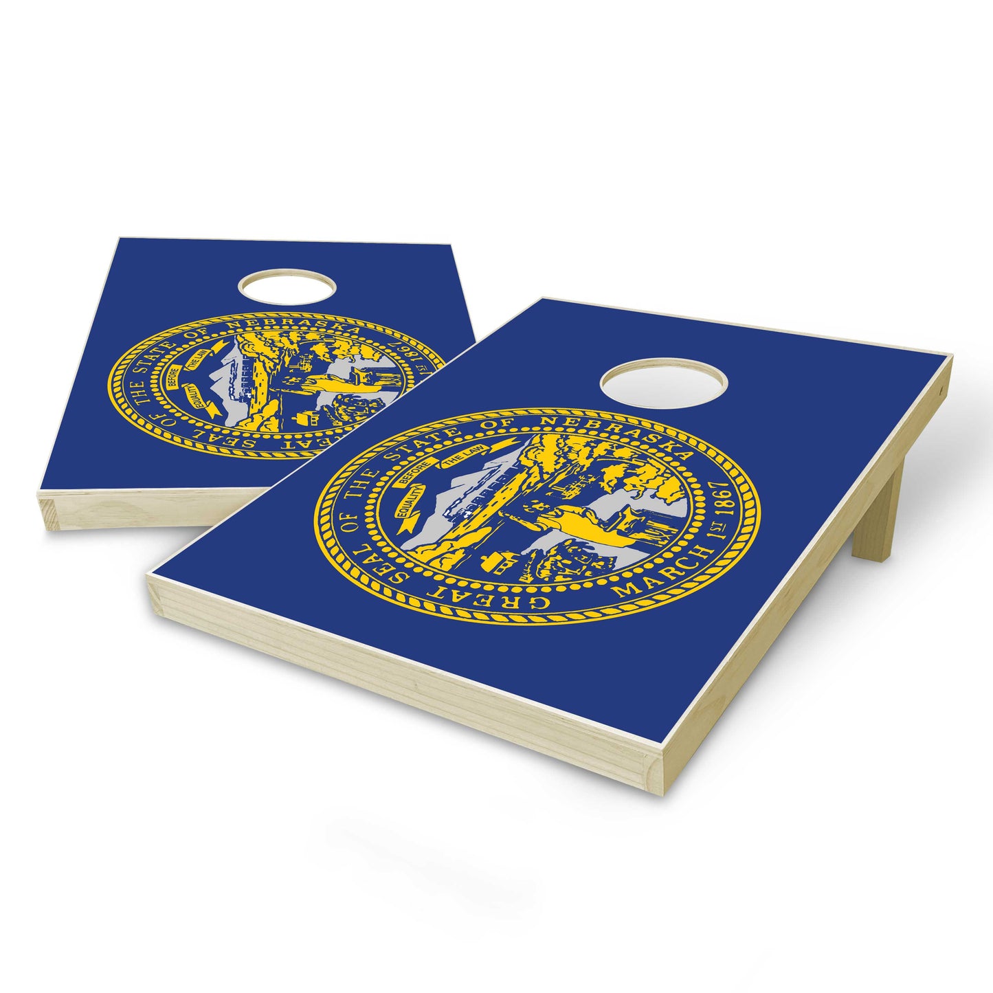 - 2 Regulation Size (24" x 36") Cornhole Boards with Nebraska Flag printed vinyl decals