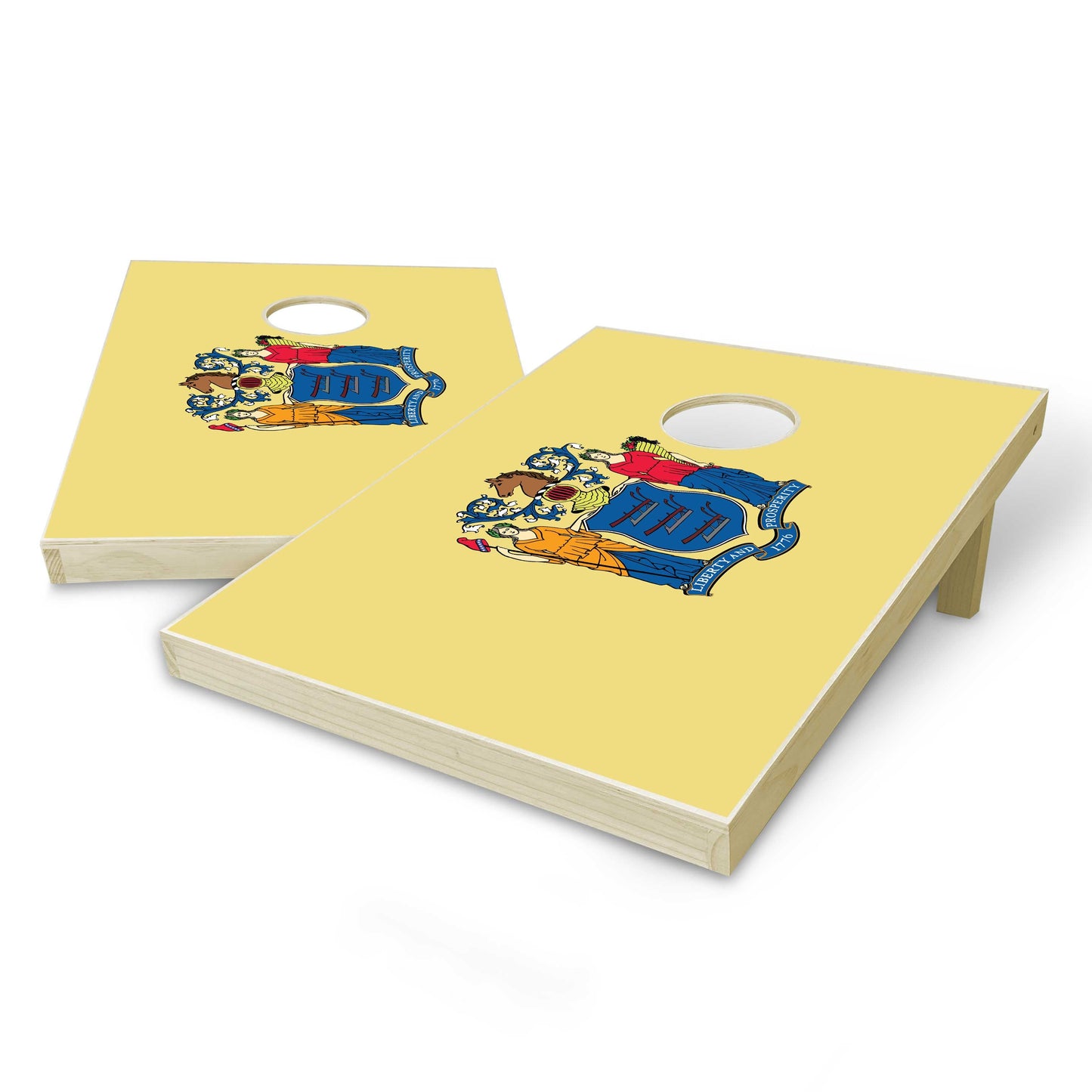Show off your New Jersey pride with this state flag designed cornhole set! Get the Country or State Flag of your choice on these durable, high-quality cornhole boards. The flag image will be printed on a vinyl decal and applied to the boards for a seamless finish.