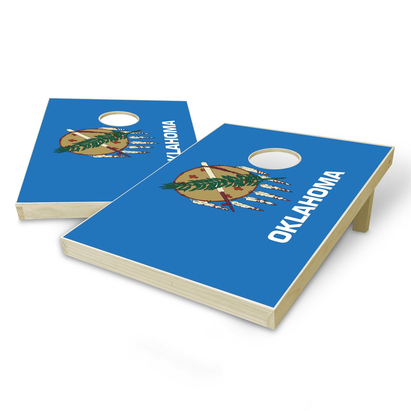 - 2 Regulation Size (24" x 36") Cornhole Boards with Oklahoma Flag printed vinyl decals