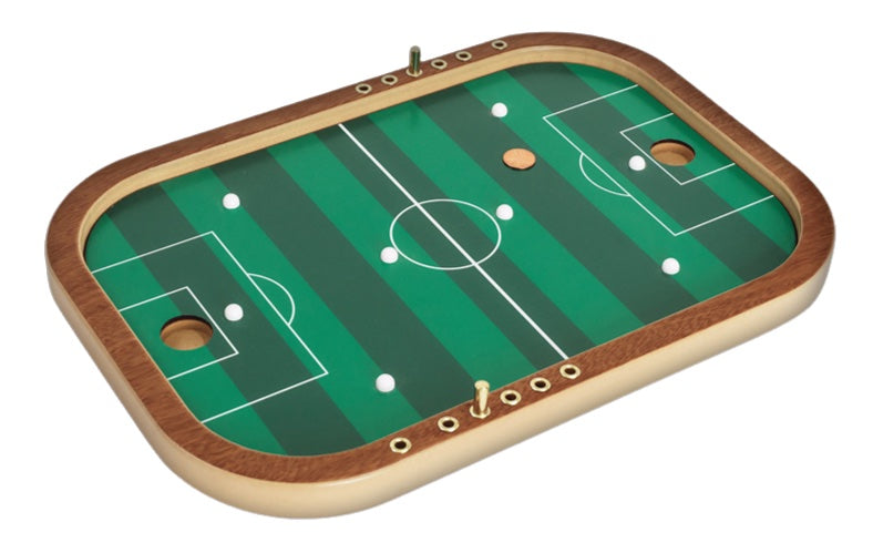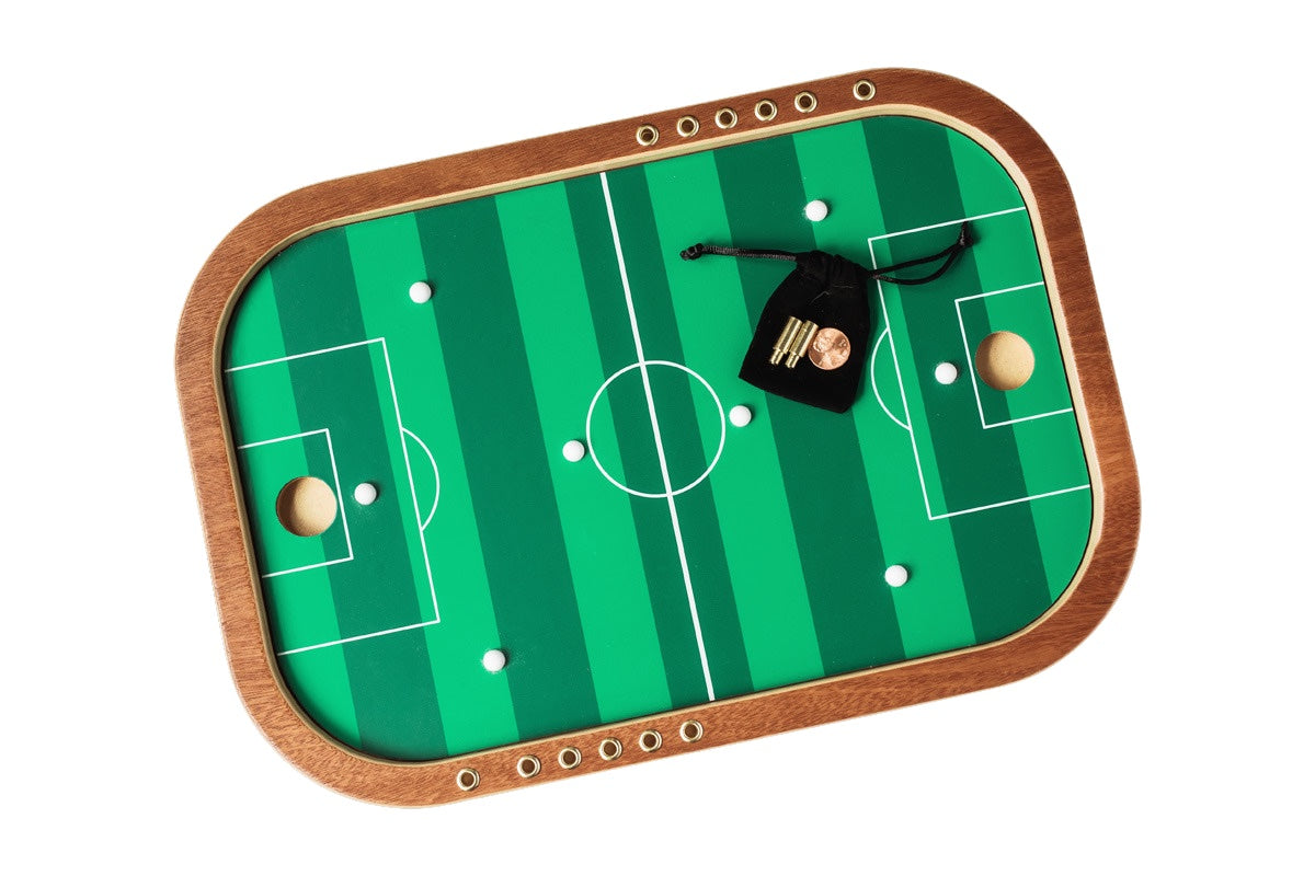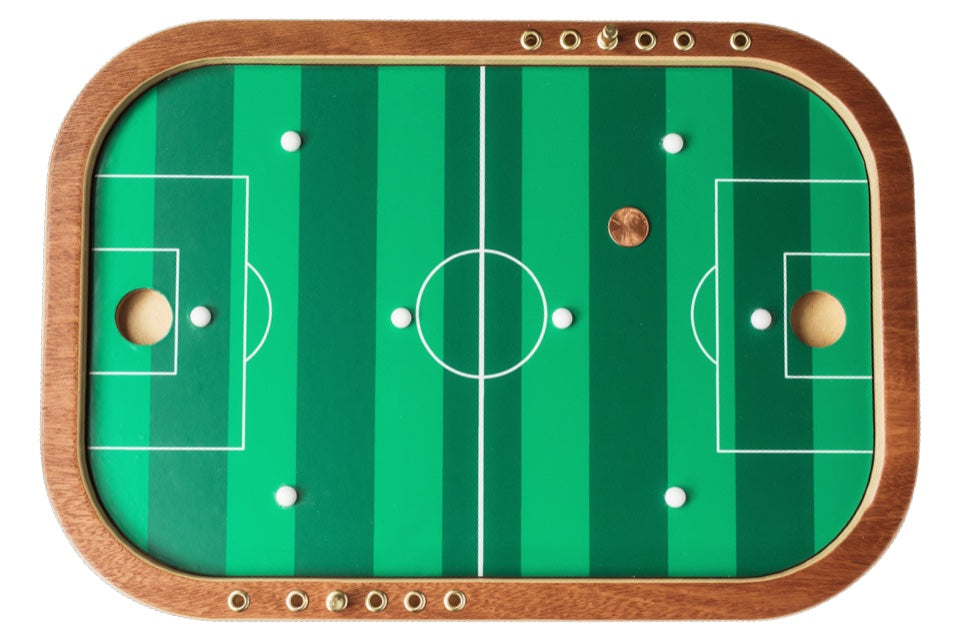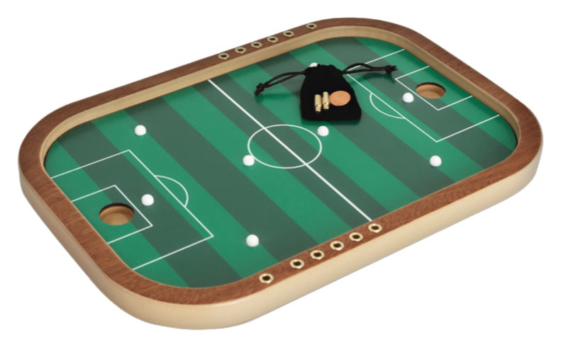 Penny Soccer tabletop game is fast-paced and fun for all ages! Shoot and score with a simple flick of your finger! A 2 player, face-to-face mini tabletop football game where players alternately flick a penny past plastic 'defenders' to score in their opponent's goal. Score is kept by moving metal pegs along the side of the board. First player to 5 wins! This mini tabletop football game features a smooth, colorful game board with a soccer pitch depicted on its surface, two metal pegs for scorekeeping, a penny, and directions. Approximate dimensions 16” x 11” x 1”. Game weighs nearly 3 lbs.