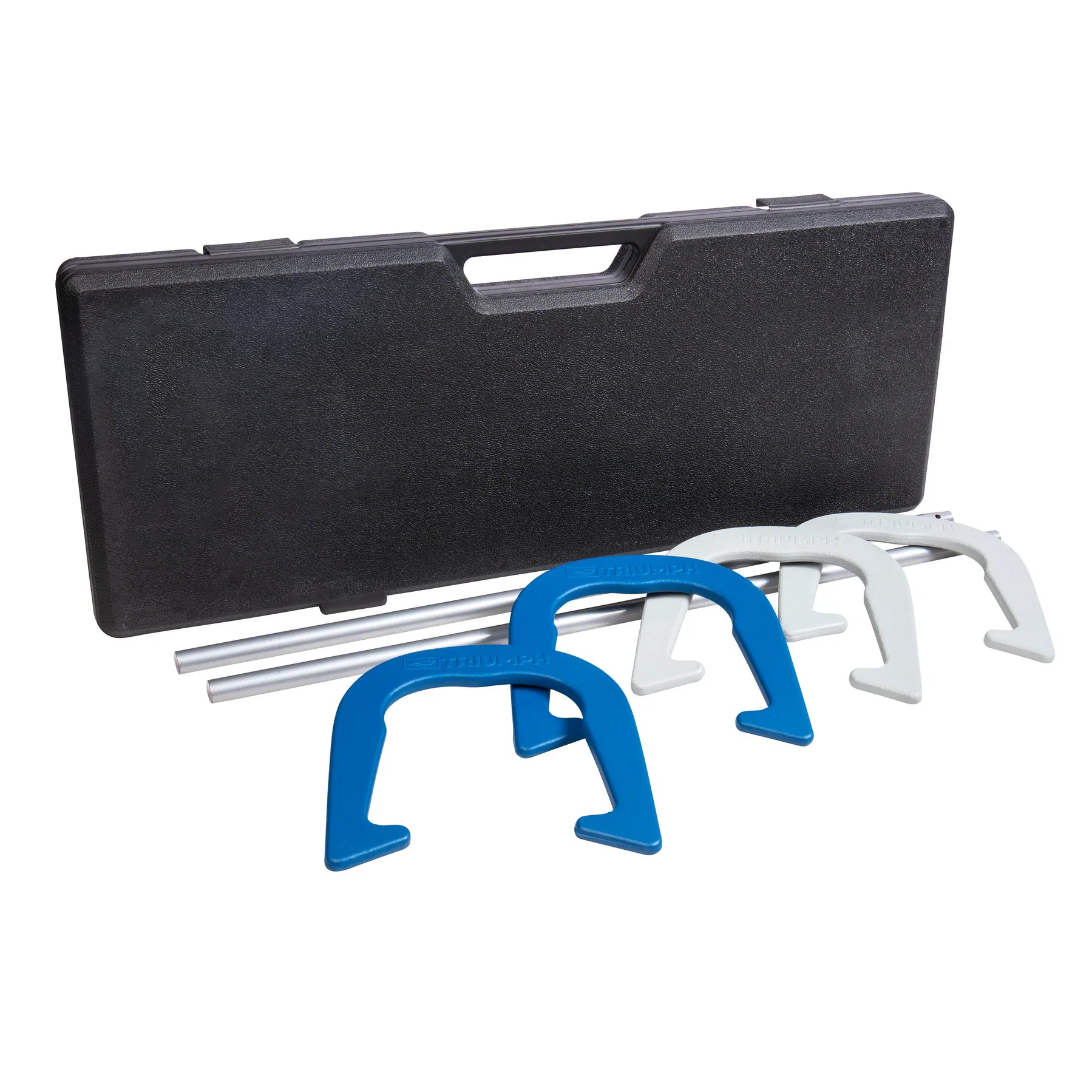 - The Triumph Forged Horseshoe Set comes ready to play with four horseshoes, two stakes and one plastic carry case.
