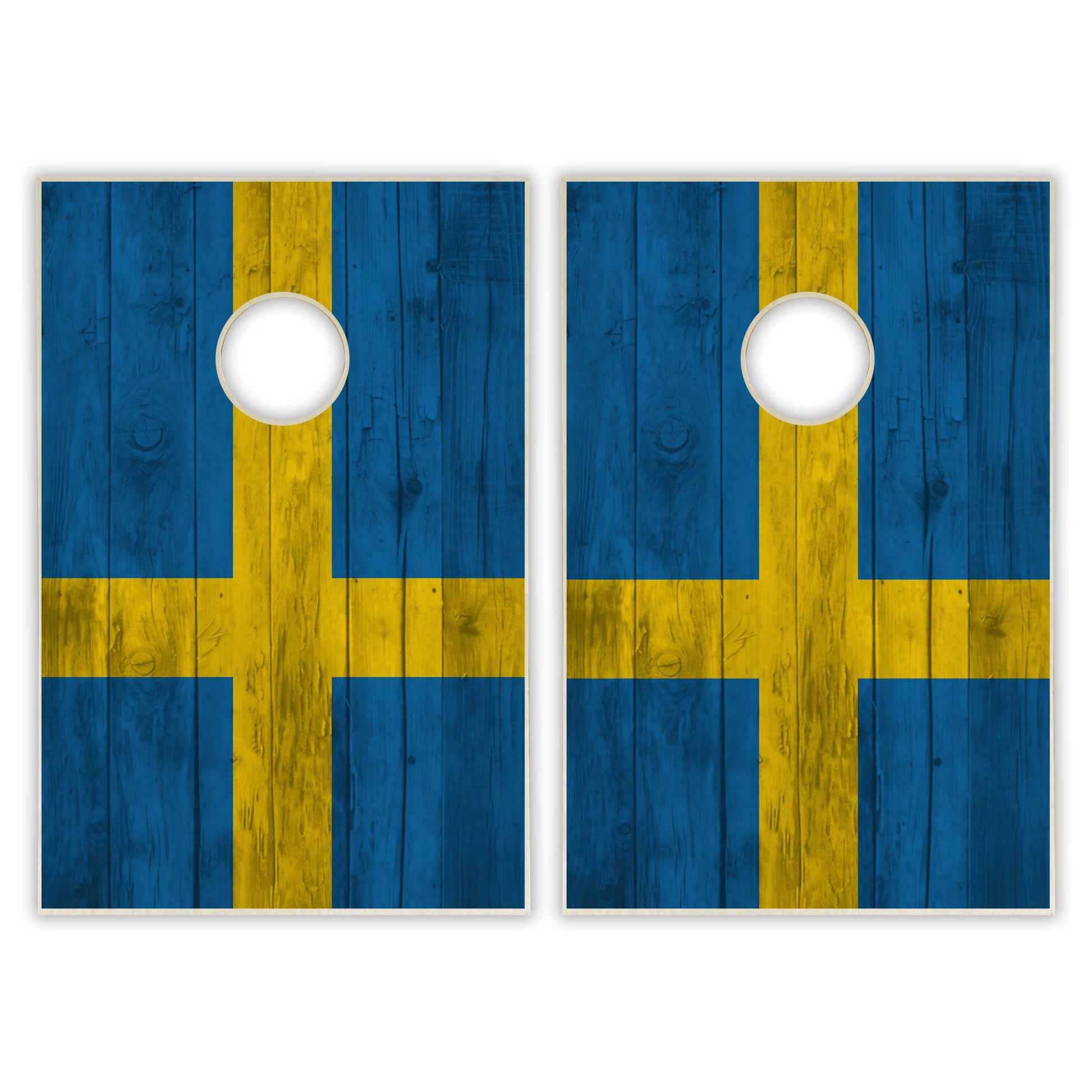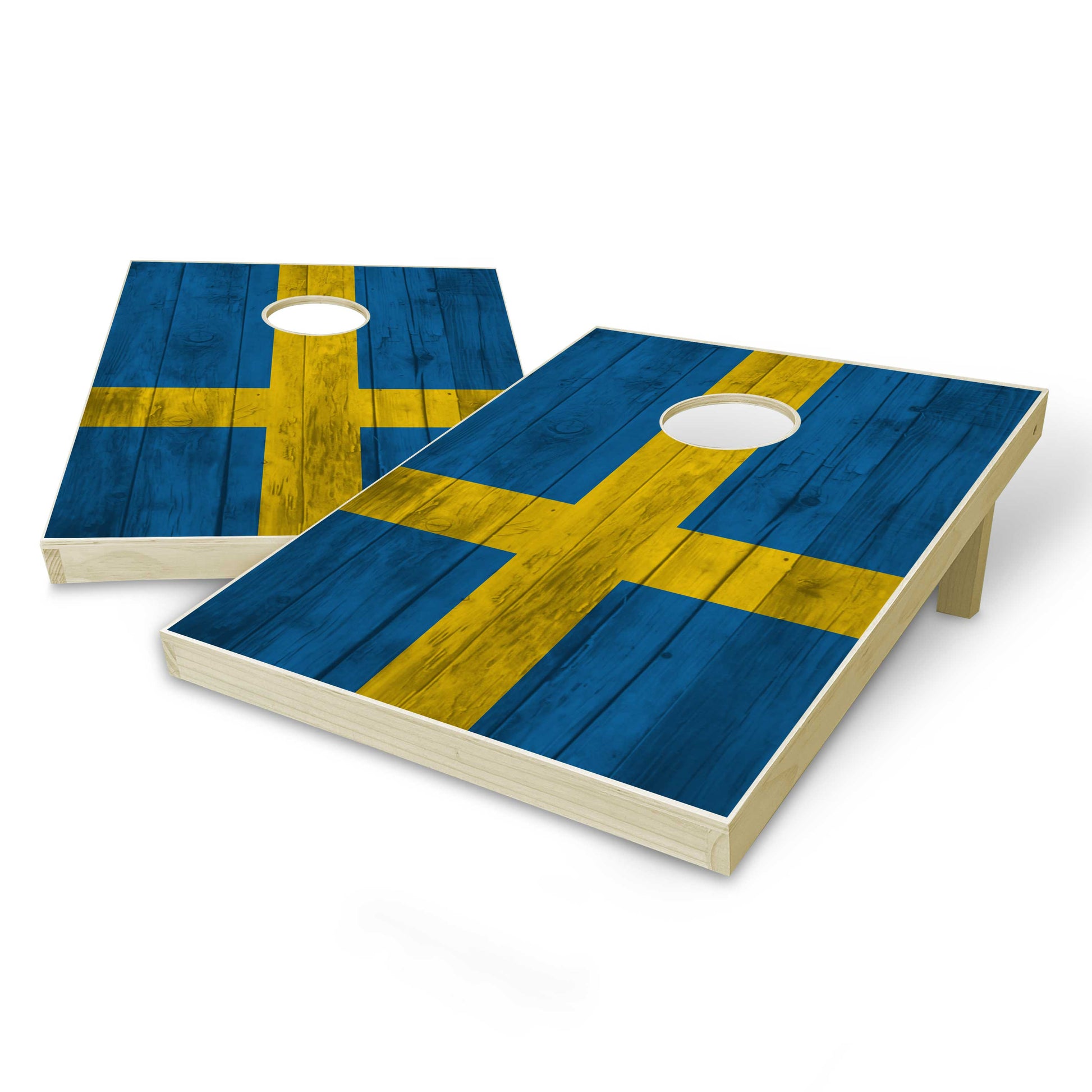 Sweden Flag Tailgate Cornhole Set - Distressed Wood