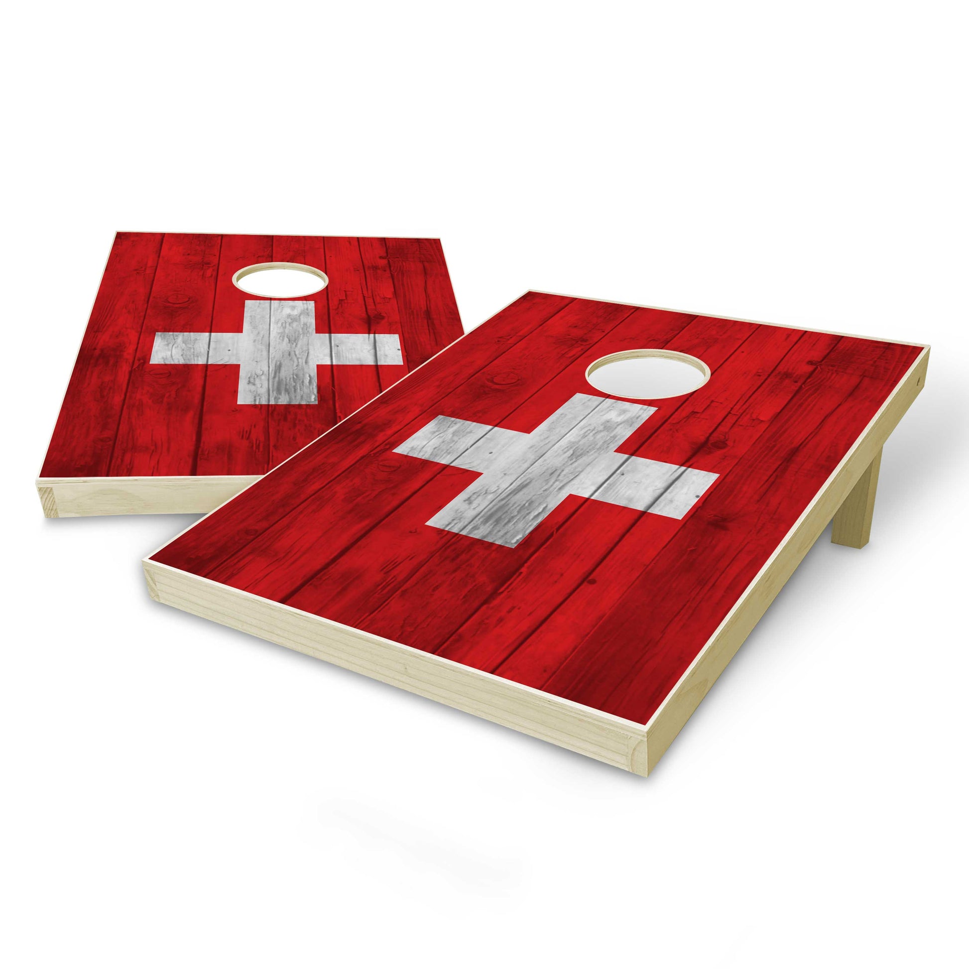 Switzerland Flag Tailgate Cornhole Set - Distressed Wood