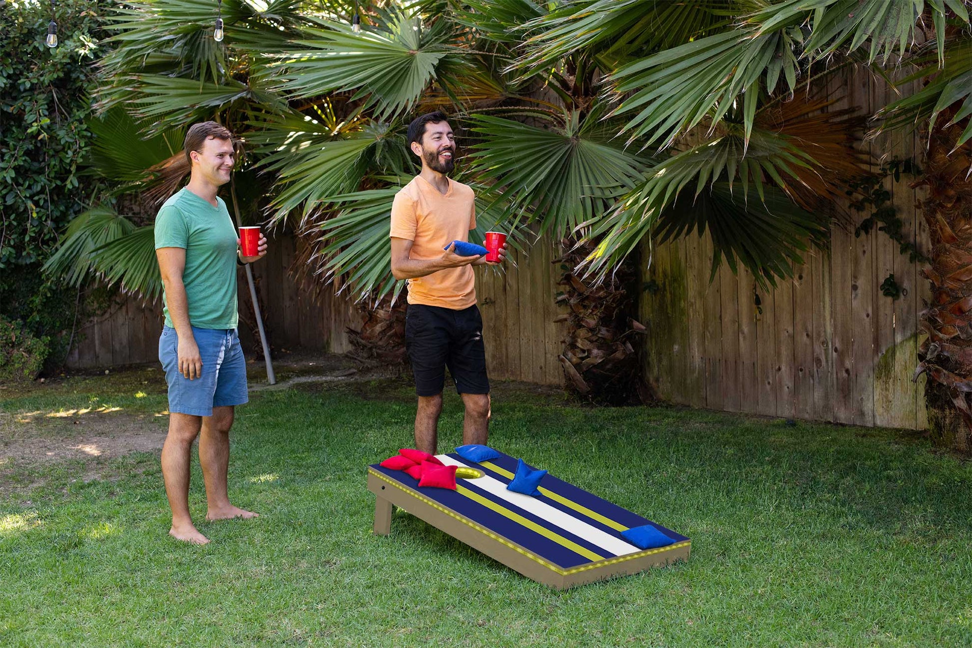 Yard Games cornhole sets are built to last. This set comes ready to play and is made with quality cabinet grade 1/2" plywood tops. The sets are regulation 24" x 48" with folding legs and sturdy frame. This meets the ACA tournament grade regulations and will last a lifetime. The sets are completely hand sanded and smooth for best handling and gameplay. Great for a BBQ, tailgating, camping, or just a relaxing day in the sun. This triangle cornhole board design is perfect for adding a decal of your favorite team.