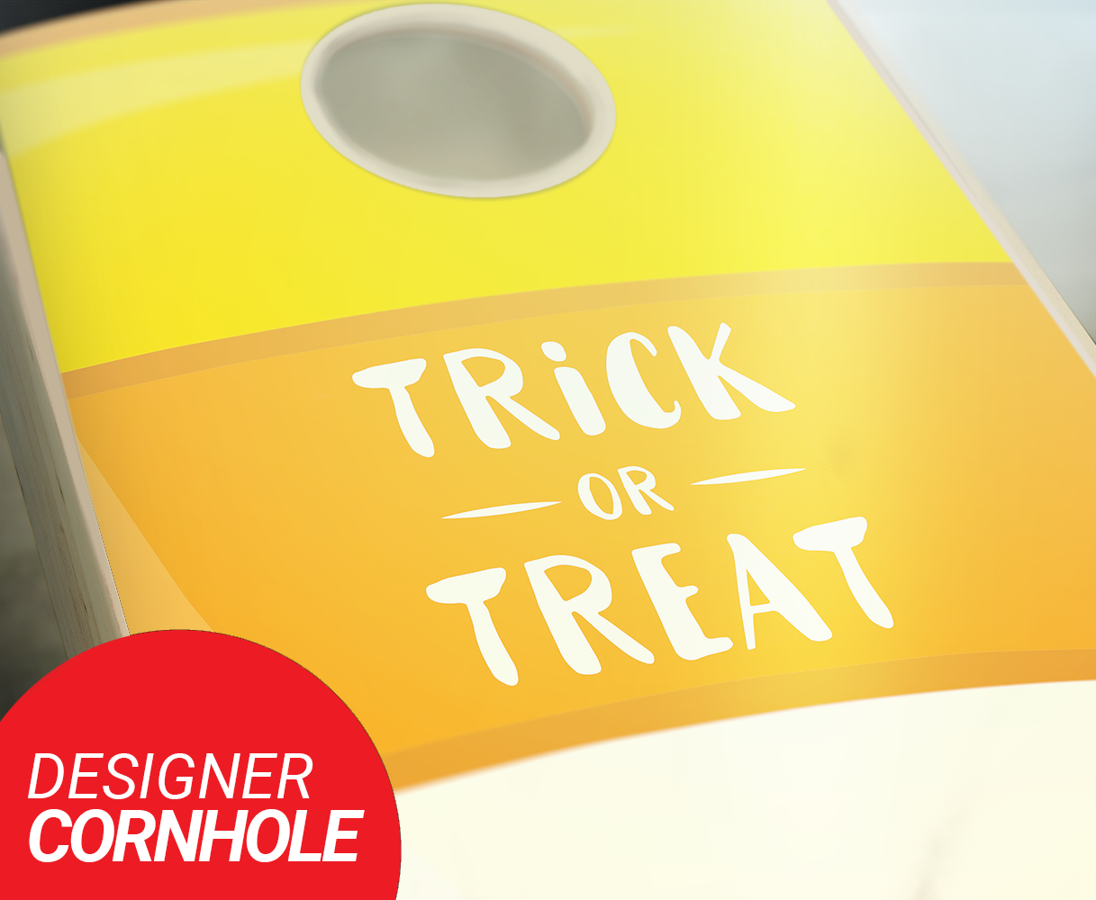 Show off at your next event with this "Trick or Treat" candy corn cornhole set! The decal is printed vinyl and finished with a clear coat polyurethane to protect your boards for years. This 24"x48" set of Halloween cornhole boards comes with folding legs and you can add a full set of 8 standard cornhole bags. The boards are completely sanded for a smooth finish. These boards are made of quality 1/2" plywood and will hold up to anything you throw at them. This Halloween themed game is a great addition to a spooky party, BBQ, camping, or just a relaxing day in the sun. Our boards are ACA Certified!