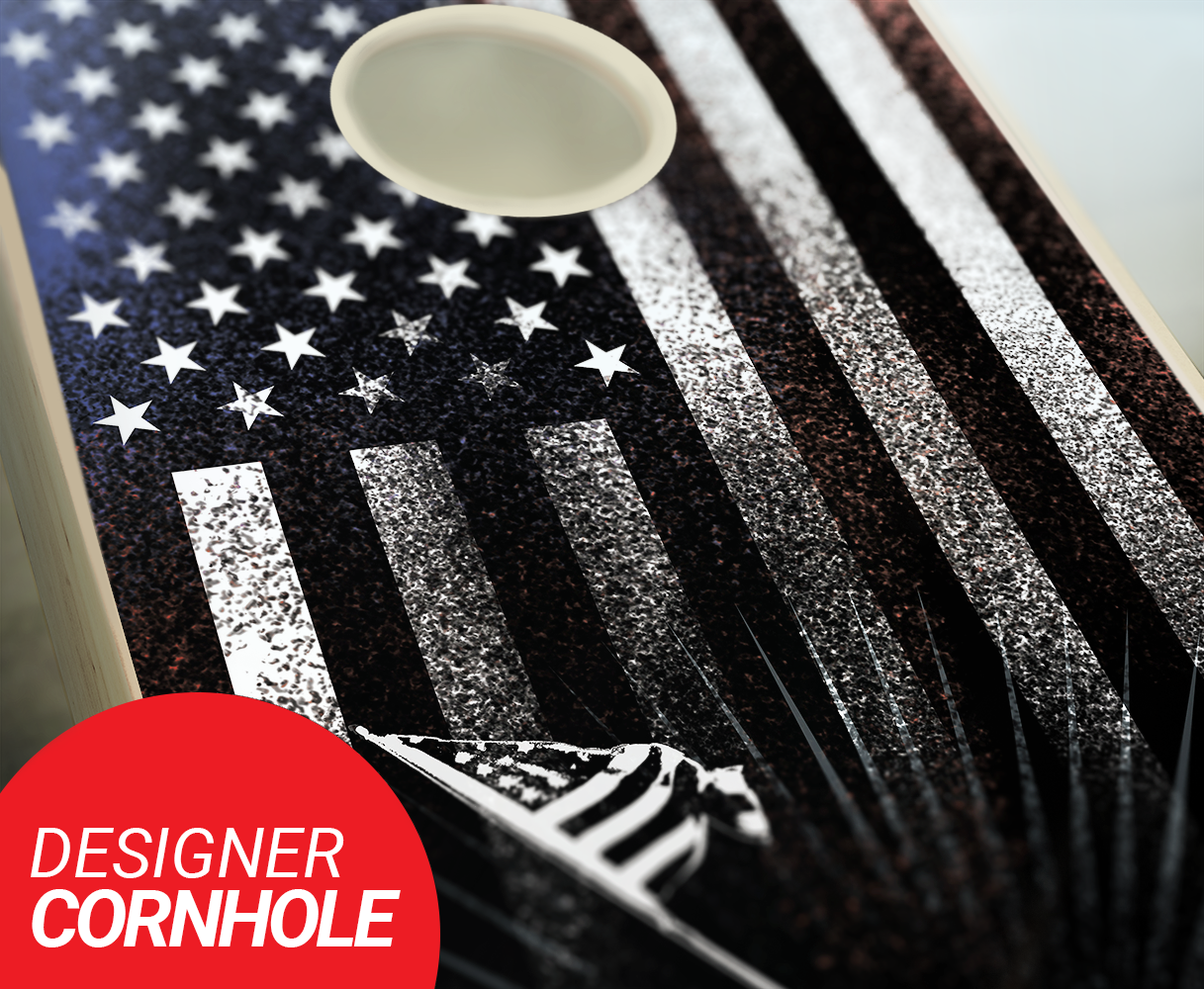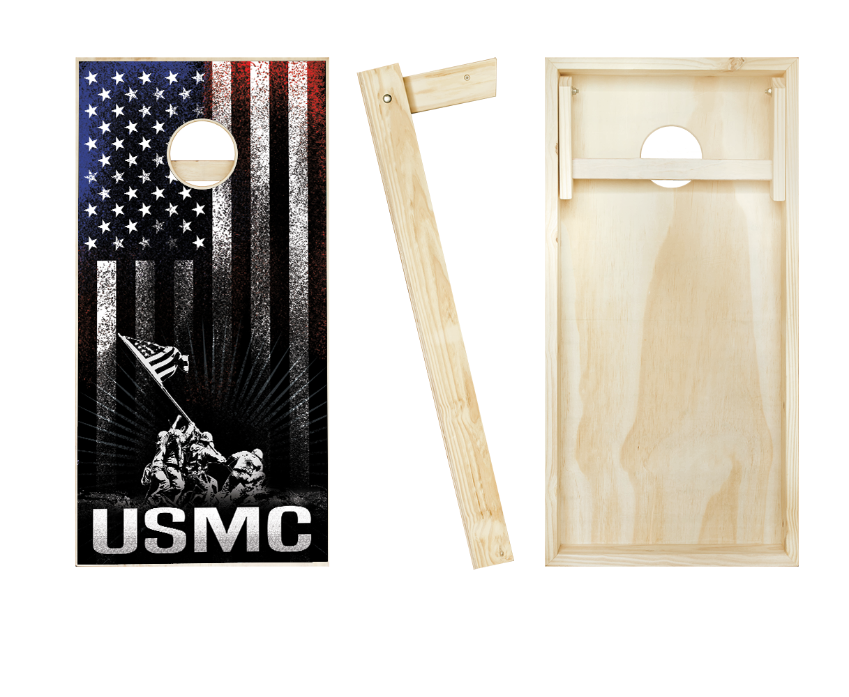 Show off at your next event with this specialty designed cornhole US Marines cornhole set! The decal is printed vinyl and finished with a clear coat polyurethane to protect your boards for years. This 24"x48" set of USMC cornhole boards comes with folding legs and you can add a full set of 8 standard cornhole bags. The boards are completely sanded for a smooth finish. These stars and strips cornhole boards are made of quality 1/2" plywood and will hold up to anything you throw at them. Great for a BBQ, tailgating, camping, or just a relaxing day in the sun. Our boards are ACA Certified!