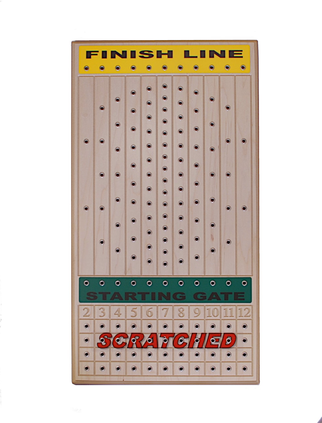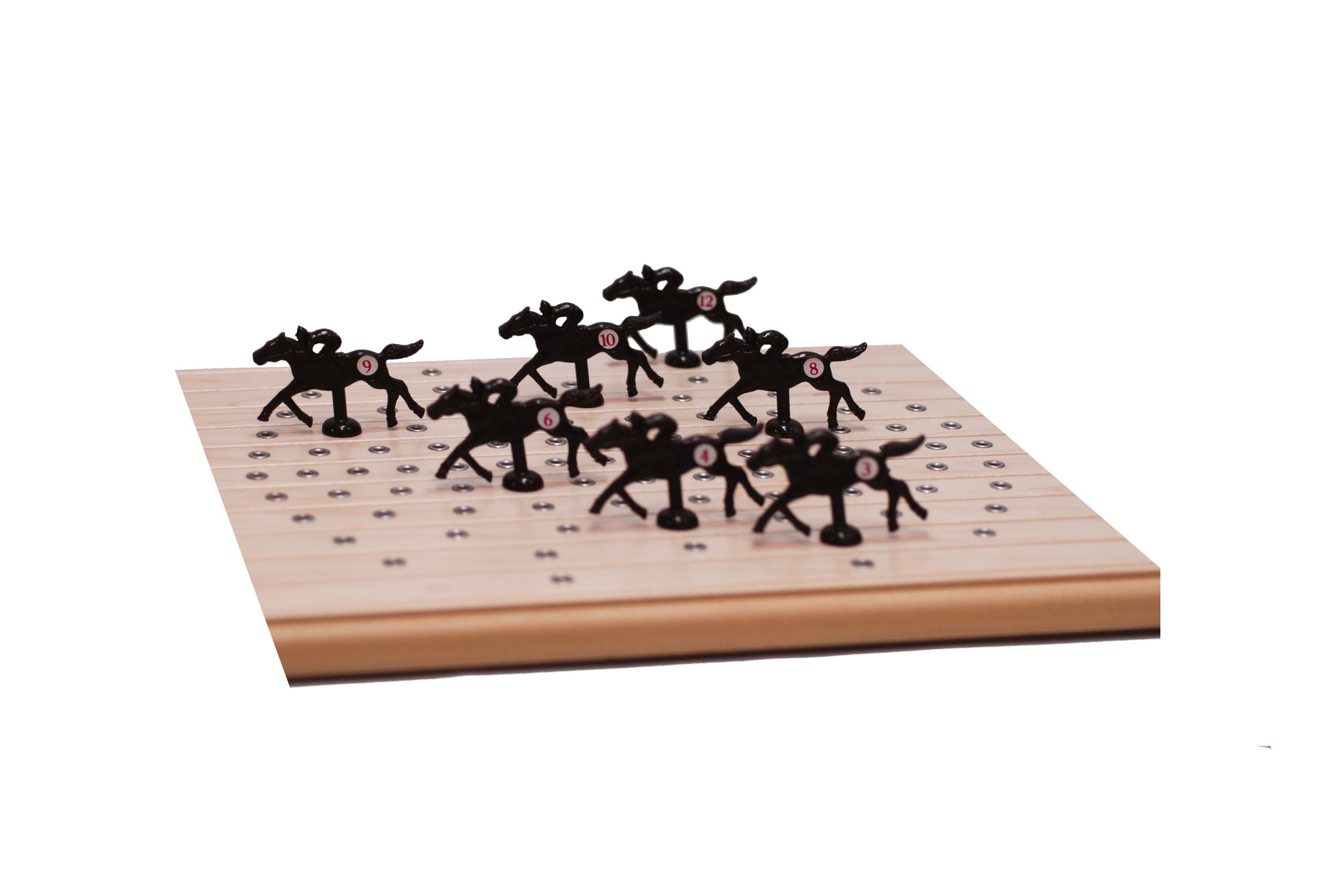 These are the highest quality handcrafted horse racing board games available. The maple wood veneer playing surface is built for longevity. Metal eyelets are driven by hand into each hole to protect your Across the Board horse racing dice game for decades of entertainment. Breathe easy; its surface is finished with an environmentally friendly, water-based clear acrylic. Scratched board game includes a deck of cards, a pair of dice, eleven numbered, plastic horses, and directions.